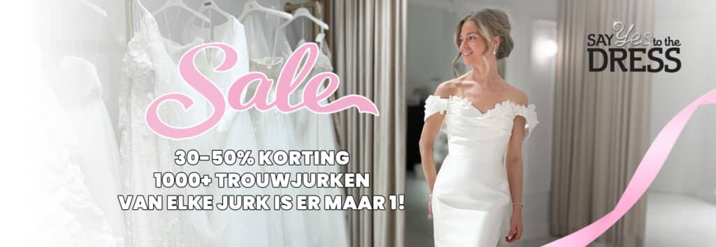 De gemiddelde prijs van een trouwjurk ligt tussen de €1500 en €2250. Maar tijdens de sale profiteer jij van 30% of 50% korting op geselecteerde modellen.
