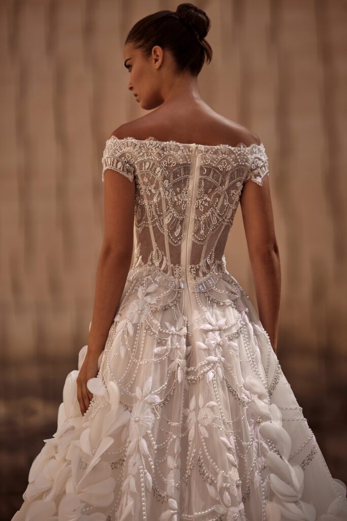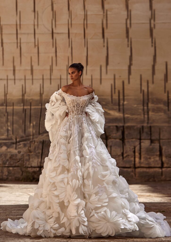 Das Belladonna Brautkleid von Milla Nova Sounds of Couture ist ein Meisterwerk an Luxus und Raffinesse, perfekt für die Braut, die an ihrem großen Tag ein Statement setzen möchte. Das Design verströmt pure Eleganz durch die Verwendung von wunderschöner Spitze, zarten Stoffen und einer atemberaubenden Passform. Das Mieder ist mit zarter Spitze und schillernden Applikationen verziert, während der weite Rock mit Lagen von Tüll und Stickereien einen dramatischen Effekt erzeugt. Das Belladonna betont die weiblichen Formen auf raffinierte Weise und bietet gleichzeitig Komfort und Bewegungsfreiheit, so dass sich die Braut selbstbewusst und schön fühlt.