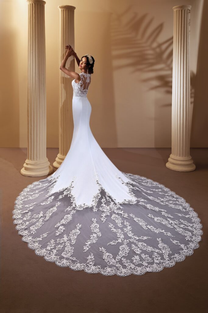 This ivory wedding dress by Demetrios features a classic lace top. The close-fitting crepe skirt combined with the lace train give a modern look.
