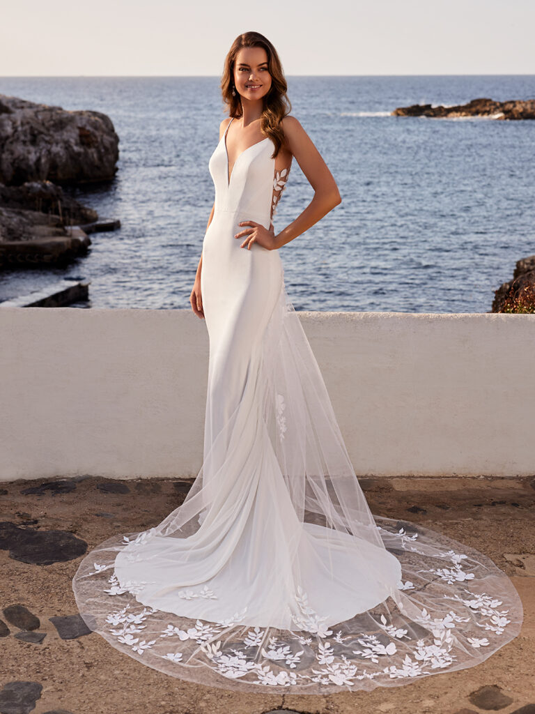 The DEIDRA wedding dress features beautifully embroidered 3D Mikado floral appliques that run from the low back to the train. With the tulle train hanging gracefully behind it, the dress exudes a sense of romance and elegance with every step. Made of luxurious crepe fabric, the bodice and skirt offer a sleek and modern silhouette, while the V-neckline adds a touch of allure.