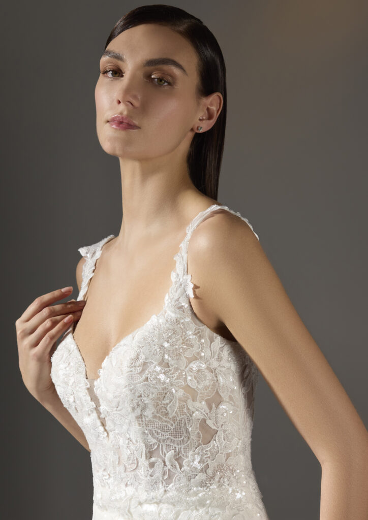 Fall in love with this mermaid lace wedding dress. The bodice has a romantic look: with floral embellished straps and a heart-shaped neckline in the front; and a flattering neckline and button closure in the back. The skirt ends in a spectacular royal train.