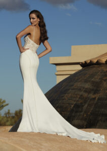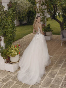 Tamar koos voor ultieme verfijning in de Pronovias Mekong. Deze jurk straalt tijdloze klasse uit met haar elegante A-lijn, verfijnd kant en subtiele details. De V-hals en delicate schouderbandjes zorgen voor een romantische uitstraling, terwijl de soepelvallende rok een dromerige look creëert.