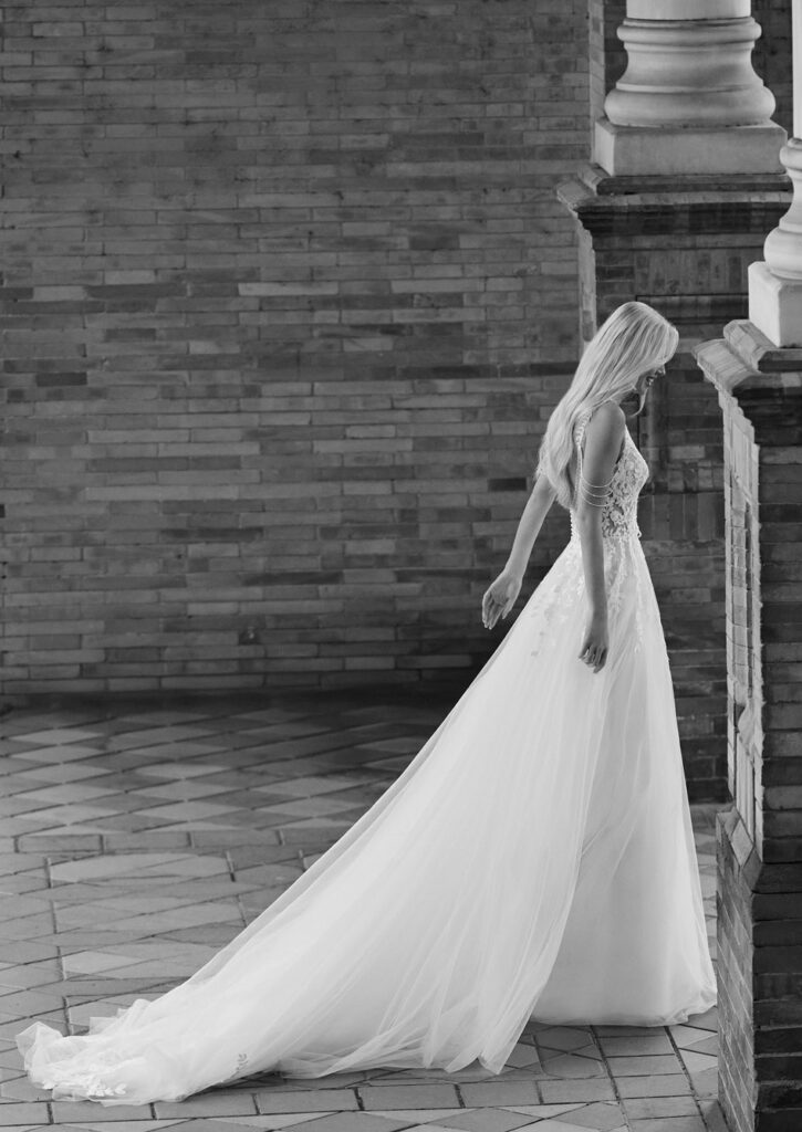 Trouwjurk Keane van Aire Barcelona, verkrijgbaar bij Koonings. Elegant en tijdloos: deze lange A-lijn trouwjurk is vervaardigd uit tule en heeft een kanten lijfje met illusie-halslijn en fijne bandjes. De open rug geeft het ontwerp een moderne, verfijnde touch, waardoor deze jurk perfect is voor de bruid die klassieke elegantie met een subtiele allure zoekt.