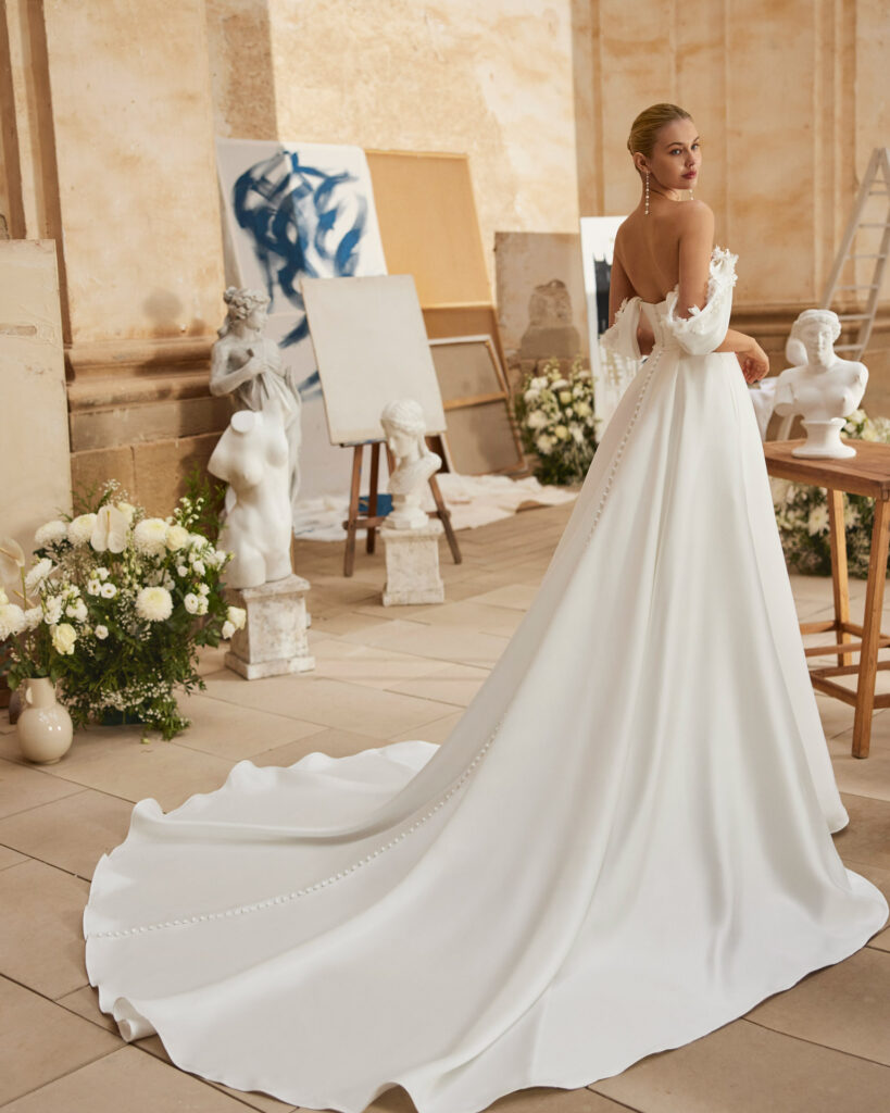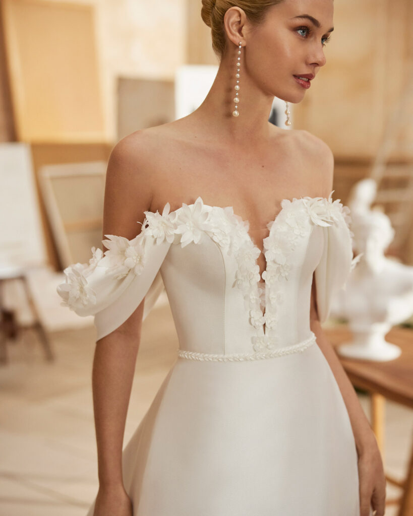 Trouwjurk Morwen van Aire Barcelona, verkrijgbaar bij Koonings. Romantisch en modern: deze volumineuze trouwjurk is vervaardigd uit sienna-stof met een gestructureerd lijfje. Het off-shoulder ontwerp, de afneembare bandjes, open rug en praktische zakken zorgen voor een elegante, veelzijdige en eigentijdse look. Perfect voor de bruid die zowel stijl als comfort wil.Model & materiaal