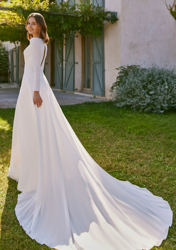 Trouwjumpsuit Naelia van Alma Novia, verkrijgbaar bij Koonings. Elegant en eigentijds: deze lange trouwjumpsuit met een rechtvallend ontwerp is vervaardigd uit crêpe. De V-halslijn, lange mouwen en open rug zorgen voor een stijlvolle en moderne uitstraling. Perfect voor de bruid die een unieke, chique en comfortabele look wil op haar grote dag.Model & materiaal