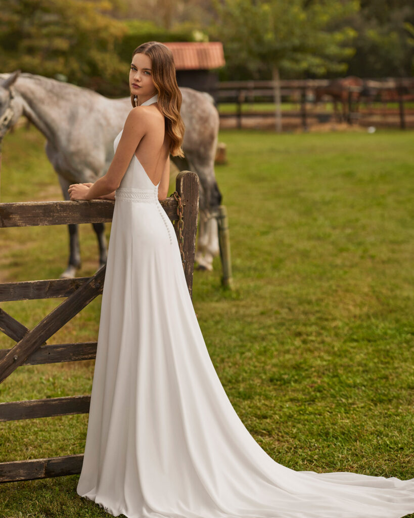 Trouwjurk Narcisa van Alma Novia, verkrijgbaar bij Koonings. Verfijnd en modern: deze lange, rechtvallende trouwjurk is vervaardigd uit crêpe en afgewerkt met kanten details. De halter-halslijn en de open rug geven de jurk een elegante en eigentijdse uitstraling. Perfect voor de bruid die eenvoud wil combineren met subtiele romantiek.
