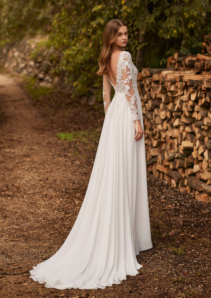 Trouwjurk Nicola van Alma Novia, verkrijgbaar bij Koonings. Elegant en verfijnd: deze lange, rechtvallende trouwjurk is vervaardigd uit georgette en kant. Het ontwerp heeft een bateau-halslijn, kanten mouwen en een open rug, wat zorgt voor een tijdloze en romantische uitstraling. Perfect voor de bruid die klassieke elegantie wil combineren met subtiele moderne details.Model & materiaal