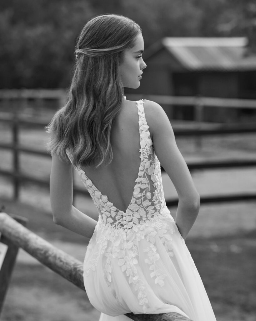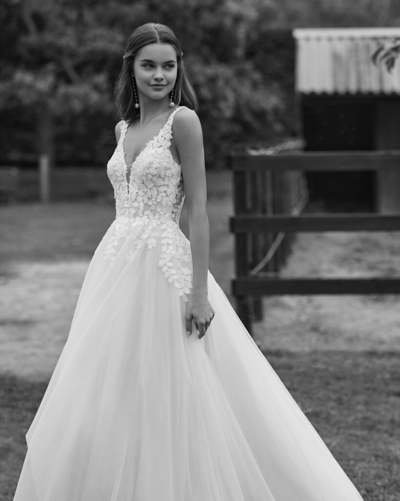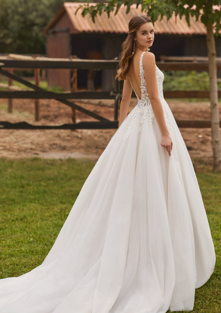 Lange A-lijn trouwjurk van het merk Alma Novia, gemaakt van glittertule en kant. De jurk heeft een diepe halslijn, bandjes en een lage rug, en is verkrijgbaar bij Koonings Bridal.