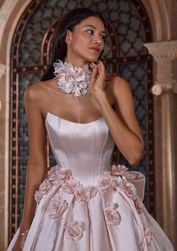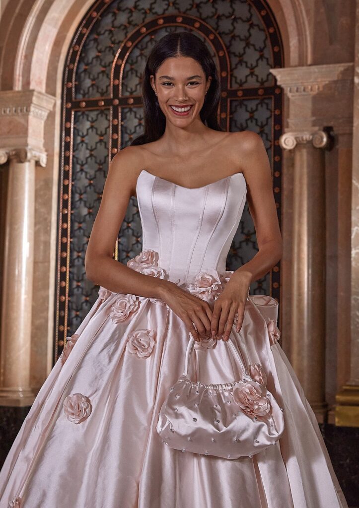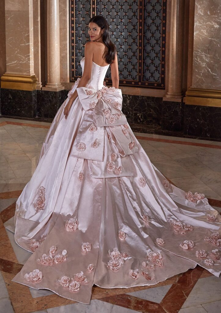 Rosabella uit de Platinum by Demetrios-collectie, verkrijgbaar bij Koonings Bridal, is een waar archieftijdperk juweel, heruitgevonden voor de moderne bruid. Gemaakt van glanzend blushkleurig satijn, combineert deze betoverende jurk klassieke grandeur met eigentijdse allure. Het gestructureerde korsetlijfje en de volle, geplooide rok zijn versierd met delicate 3D-roosjes die tijdloze romantiek oproepen. Een dramatische satijnen strik en een weelderige sleep voegen een vleugje klassieke luxe toe. Maak de koninklijke look compleet met de bijpassende SL125-mouwen en de COL17-bloemenchoker voor een werkelijk vorstelijke uitstraling.