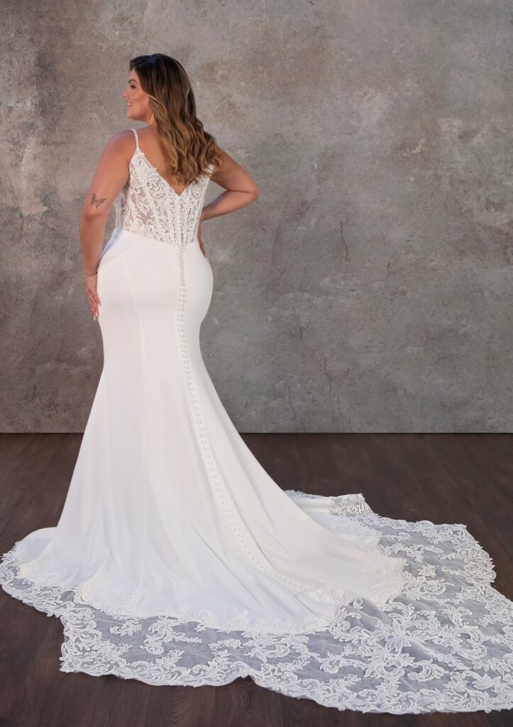 Sexy plus size column bruidsjurk van crêpe met diepe V-hals Deze elegante plus size columnjurk van crêpe en kant valt op door pareldetails en sierlijke bloemenkant. De spaghetti bandjes met parels omlijsten een diepe V-hals met illusie-tule, terwijl het aansluitende kanten lijfje overgaat in een strakke crêpe rok vanaf de klassieke Basque taille. De jurk wordt compleet gemaakt met een tijdloze kanten sleep, die moderne verfijning combineert met klassieke bruidselegantie. Verkrijgbaar bij Koonings Bridal.