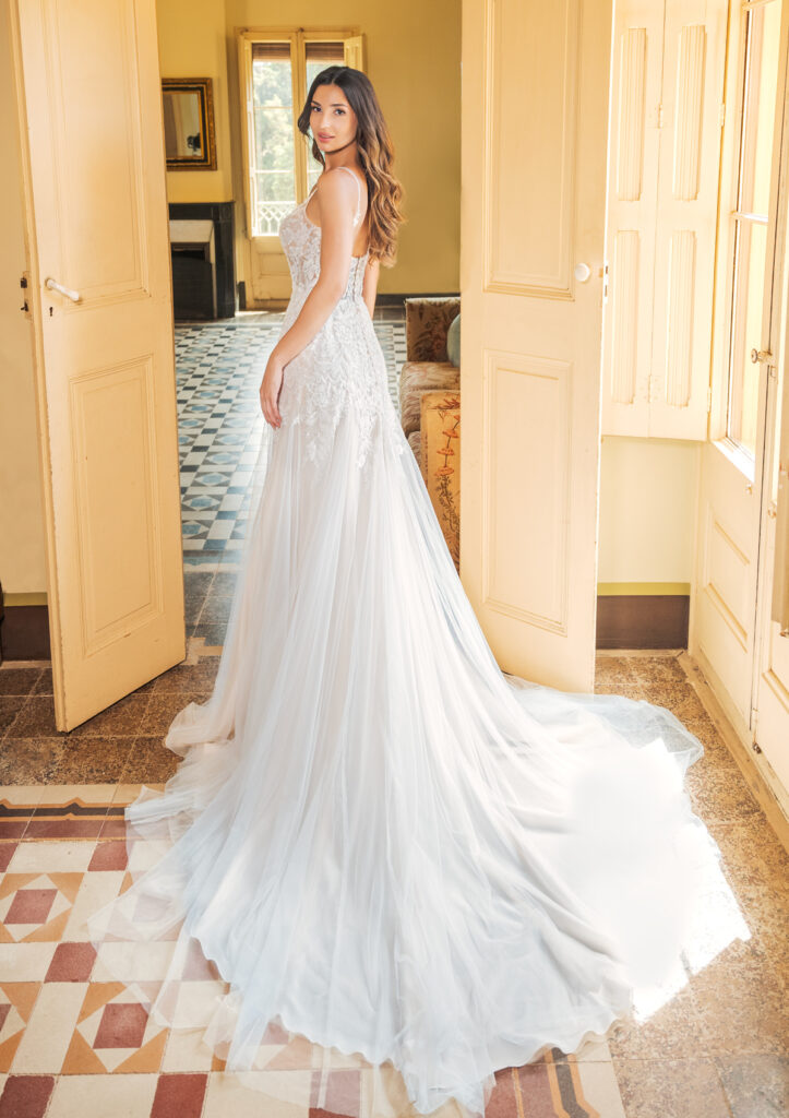 De B2601 combineert romantic en elegantie met een subtiele sensualiteit. Dankzij de ivoorkleur en het tule‑materiaal oogt de jurk zacht, tijdloos en verfijnd — perfect voor een klassieke of romantische trouwstijl. De V‑hals en het A‑lijn silhouet zorgen samen voor een flatterende pasvorm die elegant valt en mooi meebeweegt, terwijl de bandjes comfort en draaggemak bieden gedurende de hele dag. Deze jurk is een uitstekende keuze voor de bruid die houdt van een stijlvolle, romantische look zonder overdaad — elegant, verfijnd en vrouwelijk, met een moderne, luchtige subtiele charme.
