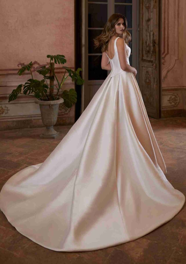 Deze mikado top heeft een flatterende basque taille en een moderne vierkante halslijn, verfraaid met delicate parels. Een verfijnd ontwerp dat tijdloze elegantie toevoegt aan elke bruidslook. Ook verkrijgbaar in satijn als Noah-B. Deze top is afkomstig uit de Hervé Paris collectie en verkrijgbaar bij Koonings Bridal.