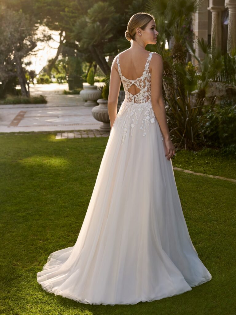 Vloeiend en verfijnd: deze A-lijn jurk van Ladybird heeft een V-hals en een keyhole-rug, vervaardigd uit delicate tule, kant en kraaltjes. Het luchtige silhouet straalt moeiteloze elegantie uit, perfect voor de moderne bruid. Verkrijgbaar bij Koonings Bridal.