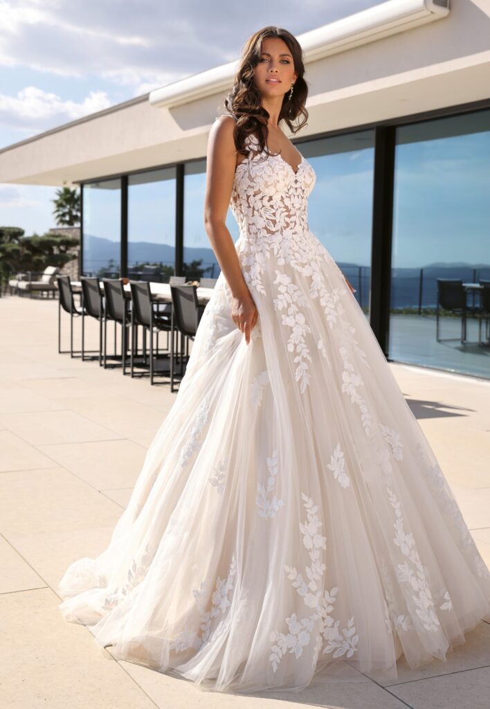 Een elegante Ladybird prinsessenjurk met een V-hals en V-rug, vervaardigd uit verfijnd kant. Het mouwloze ontwerp en de getailleerde taille zorgen voor een flatterend silhouet, perfect voor een tijdloze en stijlvolle bruid. Verkrijgbaar bij Koonings Bridal.