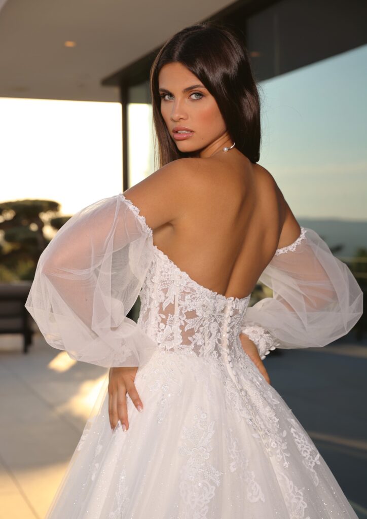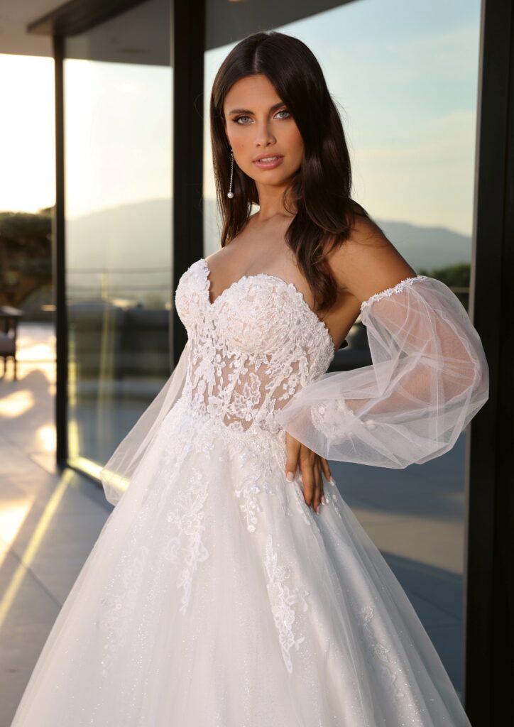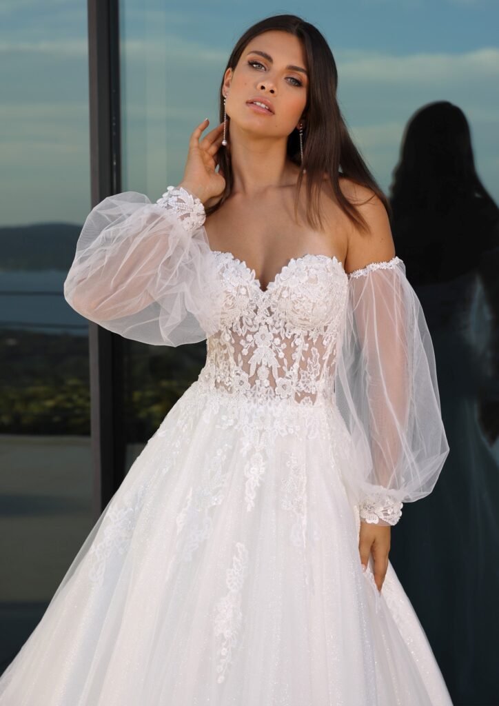 Een prachtige Ladybird prinsessenjurk met een hartvormige halslijn en lange mouwen, vervaardigd uit zachte tule. Het silhouet benadrukt elegant de taille en creëert een romantische, tijdloze uitstraling. Verkrijgbaar bij Koonings Bridal.