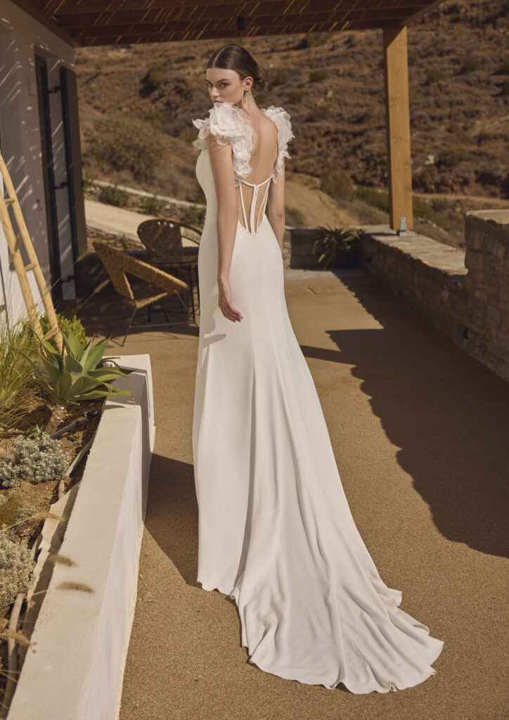Een chique fit-and-flare jurk van crêpe met een geplooid lijfje en een elegante split. De afneembare bloem-bandjes geven een vleugje vrouwelijkheid en verfijning, terwijl de strakke lijnen en het minimalistische ontwerp de jurk perfect maken voor de moderne bruid. Voor een strakke en verfijnde uitstraling is dit model ook verkrijgbaar zonder de bandjes als Hilary-D. Dit ontwerp komt uit de Le Papillon by Modeca collectie en is verkrijgbaar bij Koonings.Model & materiaal
