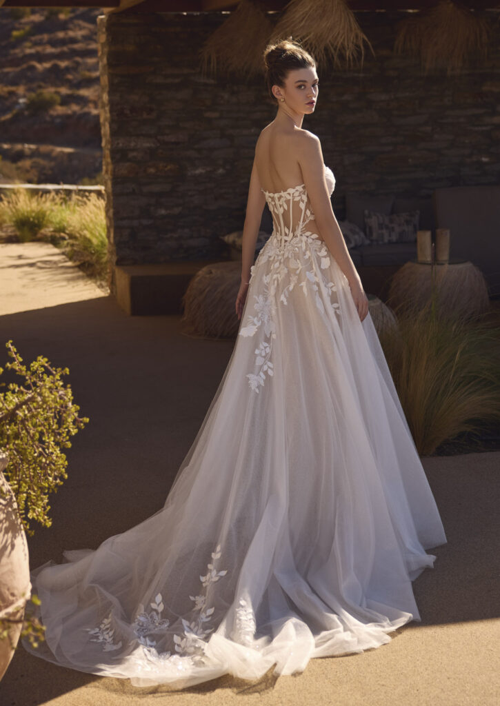 Een gedurfde A-lijn jurk met een strapless, diep uitgesneden hartvormige halslijn die pure zelfverzekerdheid uitstraalt. Het geplooide lijfje van sprankelend tule geeft extra diepte en textuur, terwijl het met kraaltjes afgewerkte kant de glinsterende tule rok siert. Het resultaat is een betoverende en onvergetelijke look – perfect voor de bruid die elegantie wil combineren met lef. Dit bijzondere ontwerp is onderdeel van de Le Papillon by Modeca collectie en verkrijgbaar bij Koonings.