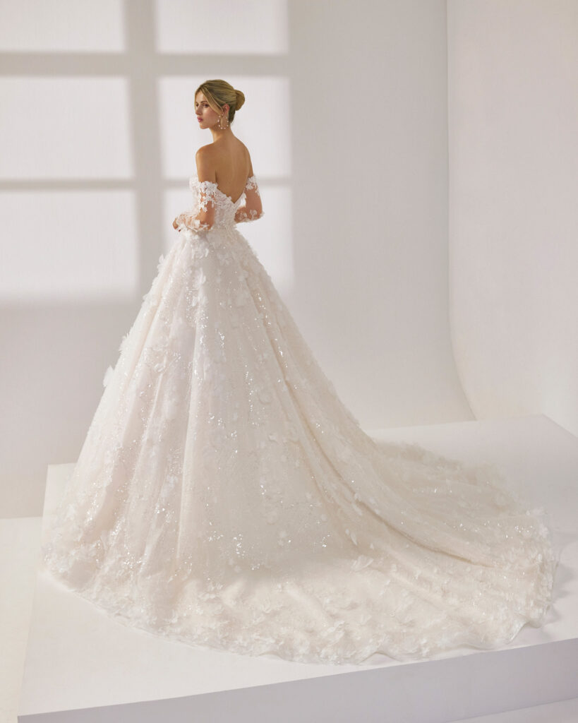 Ambra van Luna Novias, verkrijgbaar bij Koonings. Een lange trouwjurk met een volumineus silhouet, vervaardigd uit sneeuwwit glittertule. Het ontwerp heeft een strapless halslijn, lange mouwen en een open rug, wat zorgt voor een glamoureuze en romantische uitstraling. Perfect voor de bruid die klassieke elegantie wil combineren met een sprankelend, modern accent.