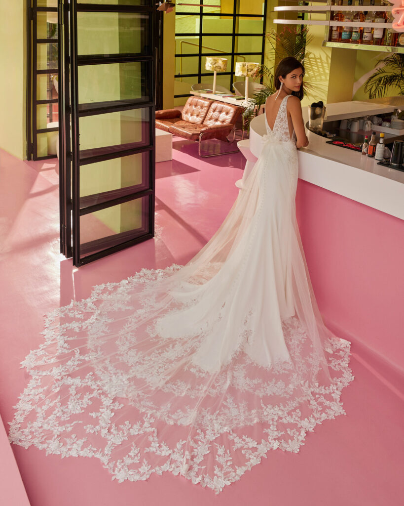 Janid van Luna Novias, verkrijgbaar bij Koonings. Een lange two-piece A-lijn trouwjurk, vervaardigd uit stretch crêpe. Het ontwerp heeft een elegante V-halslijn, een verfijnde V-rug en een stijlvolle sleep, perfect voor de bruid die klassieke elegantie wil combineren met moderne verfijning.Model & materiaal