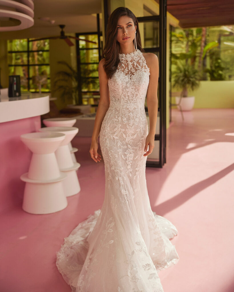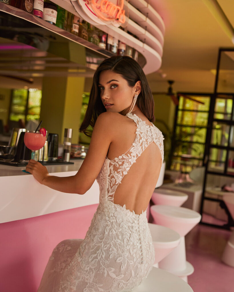 Jayla van Luna Novias, verkrijgbaar bij Koonings. Een lange two-piece mermaid trouwjurk, vervaardigd uit kant en versierd met kralen. Het ontwerp heeft een halter-halslijn, een ronde open rug en een bijpassende overskirt, wat zorgt voor een elegante en verfijnde uitstraling. Perfect voor de bruid die klassieke vormen wil combineren met een romantisch, modern accent.