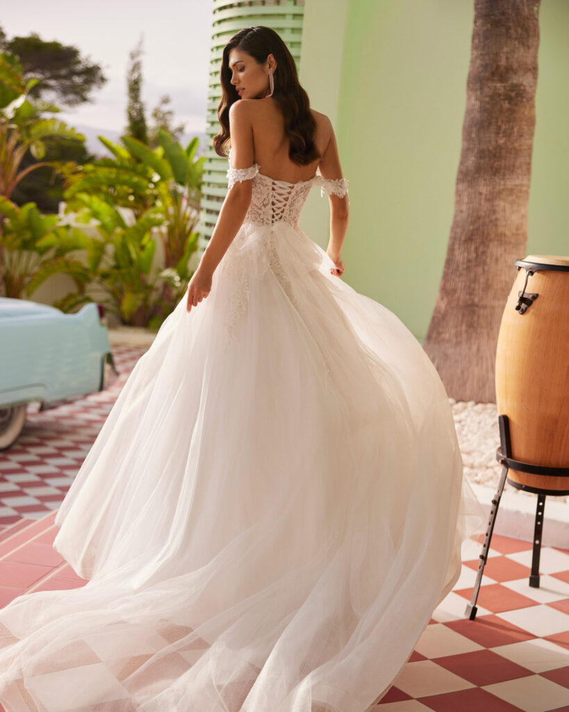 Jeri van Luna Novias, verkrijgbaar bij Koonings. Een lange baljurk trouwjurk, vervaardigd uit glittertule. Het ontwerp heeft een sweetheart-halslijn, lage bandjes en een rug met korsetdetail, wat zorgt voor een glamoureuze en elegante uitstraling. Perfect voor de bruid die klassieke vormen wil combineren met een sprankelend, modern accent.