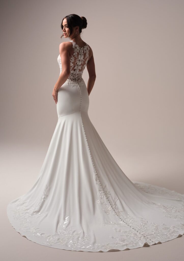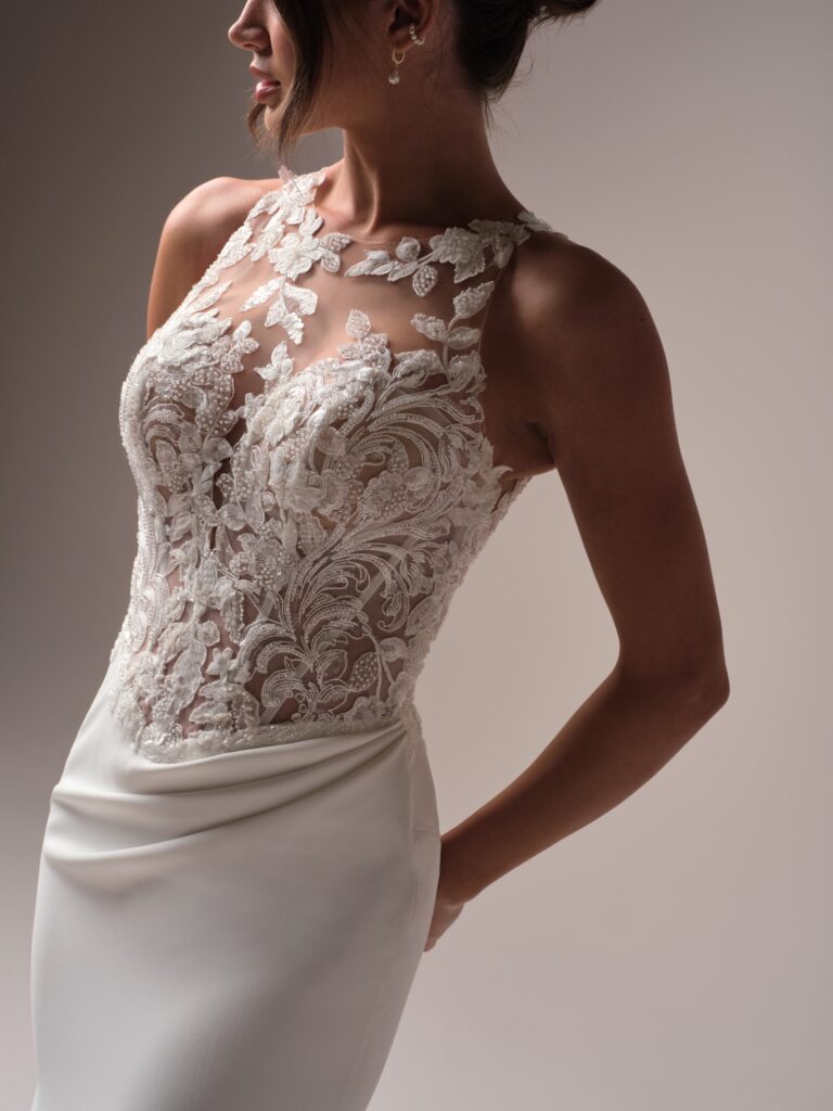 Een luxe fit-and-flare bruidsjurk van Maggie Sottero in crepe en kant, met een sexy halterneck die elegantie en verfijning uitstraalt. Perfect voor de bruid die een moderne en sensuele uitstraling wil. Verkrijgbaar bij Koonings Bridal, ’s werelds grootste bruidsmodespeciaalzaak.