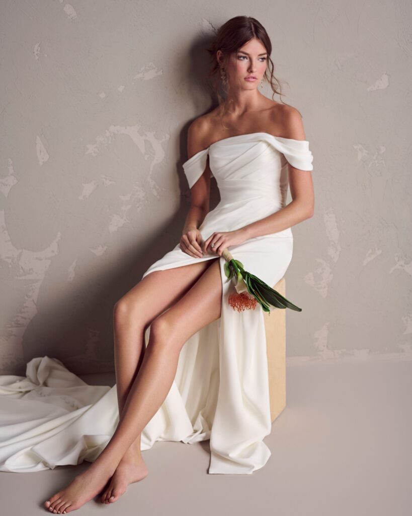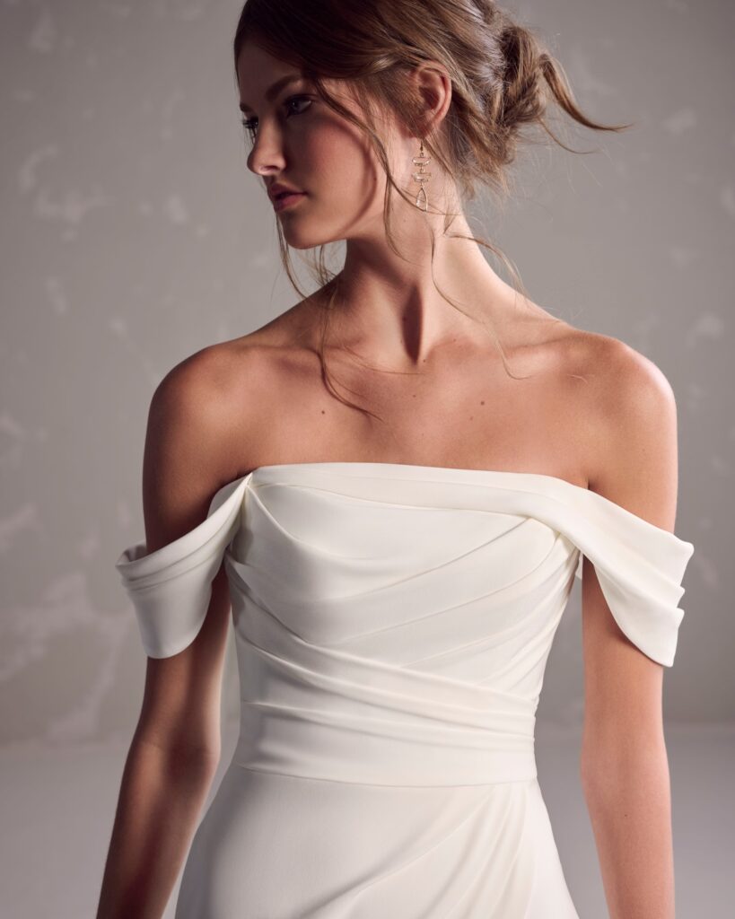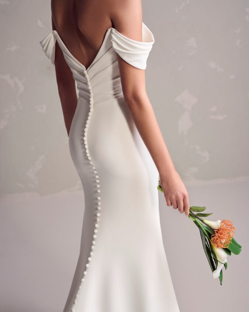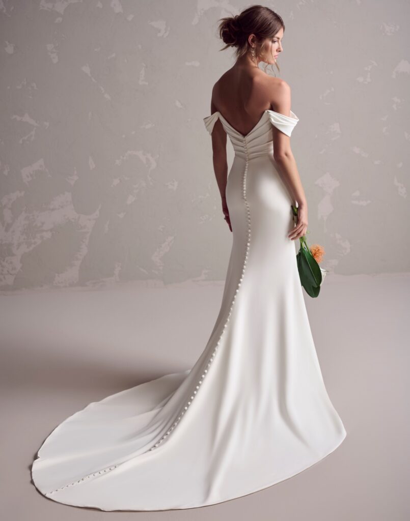 Elegante trouwjurk van recycled crepe met off-the-shoulder mouwtjes en V-rug, ontworpen door Maggie Sottero. Verkrijgbaar bij Koonings Bridal.