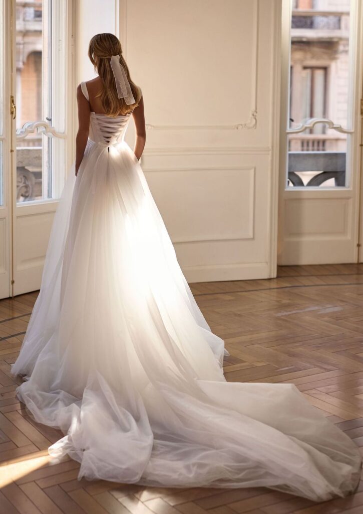 Style Briselle uit de Milla Nova-collectie, verkrijgbaar bij Koonings Bridal, is een dromerige A-lijn bruidsjurk met een gestructureerd satijnen korsetlijfje en een delicate tule-rok. De hartvormige halslijn met breed geplaatste bandjes benadrukt het decolleté en biedt extra steun, terwijl het korset is voorzien van baleinen, ingebouwde cups en een elegante rijgsluiting. De luchtige tule-rok voegt een zachte, romantische beweging toe en maakt de look compleet.