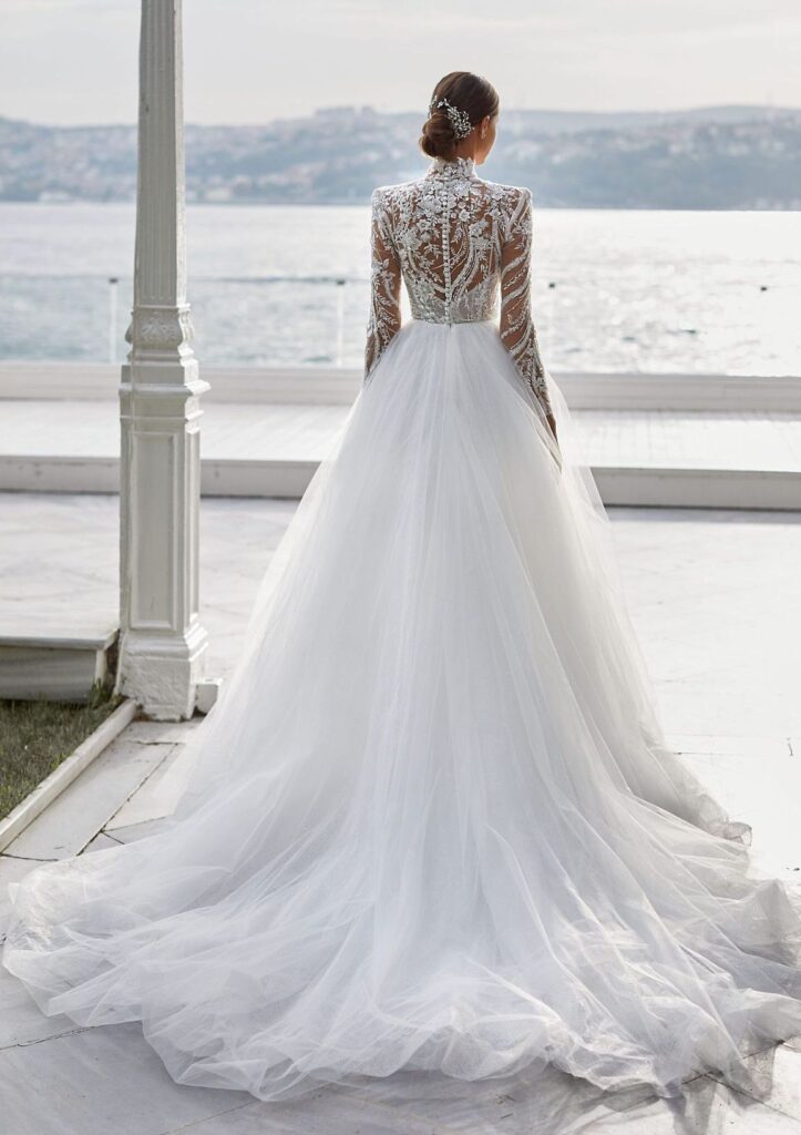 Style Carmen uit de Milla Nova-collectie, verkrijgbaar bij Koonings Bridal, is een chique baljurk van tule met lange mouwen en een semi-transparant versierd lijfje. De jurk heeft een col, een top met kanten applicaties en een rugsluiting met knoopjes, en een volumineuze tule-rok die elegant uitloopt in een lange sleep.