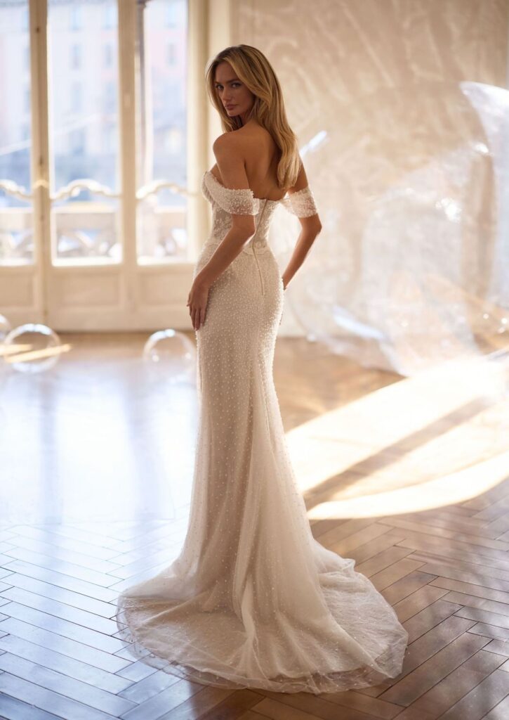 Style Faylora uit de Milla Nova-collectie, verkrijgbaar bij Koonings Bridal, straalt Old-Hollywood glamour uit. Deze zeemeerminbruidsjurk is vervaardigd uit fijne kant, rijkelijk versierd met glinsterende pailletten. Het off-the-shoulder ontwerp heeft een aansluitend lijfje met zichtbare baleinen die het silhouet elegant verlengen, een gedrapeerde hartvormige halslijn en afneembare off-the-shoulder kanten mouwen. De jurk sluit met een ritssluiting aan de achterkant en valt zachtjes uit in een vloerbedekkende rok, subtiel gedrapeerd over de heupen voor een flatterend effect, met een verleidelijke split aan de zijkant en een korte, subtiele sleep.