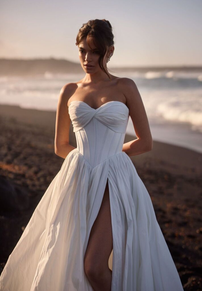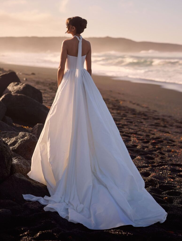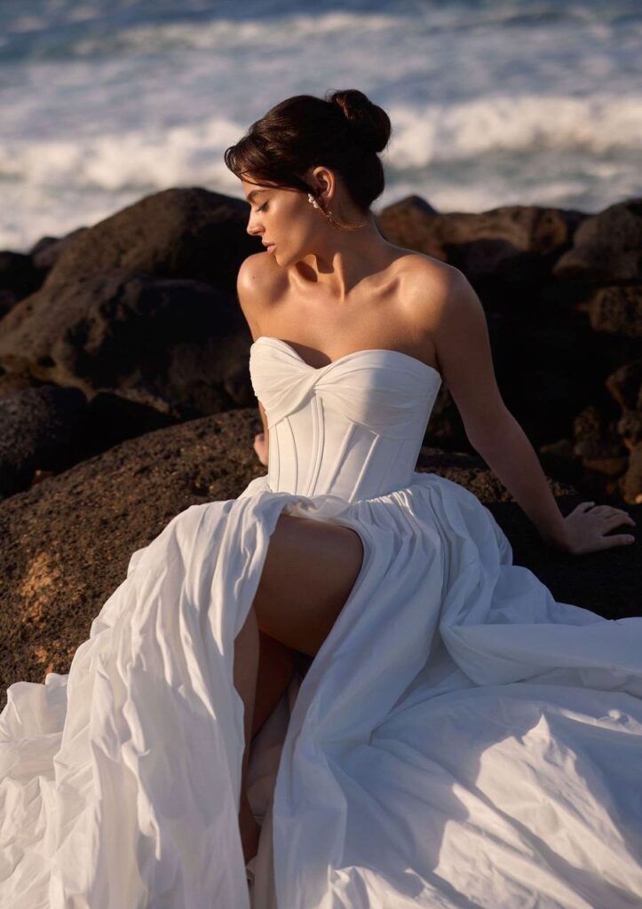 Style Fleur uit de Milla Nova-collectie, verkrijgbaar bij Koonings Bridal, is een verfijnde, strapless A-lijn bruidsjurk met een sculpturaal korset en een hartvormige twist-knoop halslijn, subtiel geaccentueerd met zachte draperingen en verticale baleinen voor een perfecte pasvorm. De jurk wordt geleverd met afneembare off-the-shoulder mouwen. De volumineuze rok valt elegant vanaf de taille, met delicate plooien en een vloeiende sleep. Maak de look compleet en geef een extra luxueuze touch met de Danessa-sjaal.