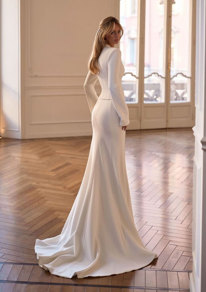 Style Ivette uit de Milla Nova-collectie, verkrijgbaar bij Koonings Bridal, is een perfect op maat gemaakte, moderne zeemeerminbruidsjurk met lange mouwen, vervaardigd uit gabardine. De jurk heeft een scherpe V-halslijn, gestructureerde schouders en een aansluitend lijfje dat het silhouet elegant benadrukt. De achterkant sluit met een strakke ritssluiting, terwijl de aansluitende rok uitloopt in een subtiel geplooide zoom met korte sleep voor een moderne, verfijnde uitstraling.