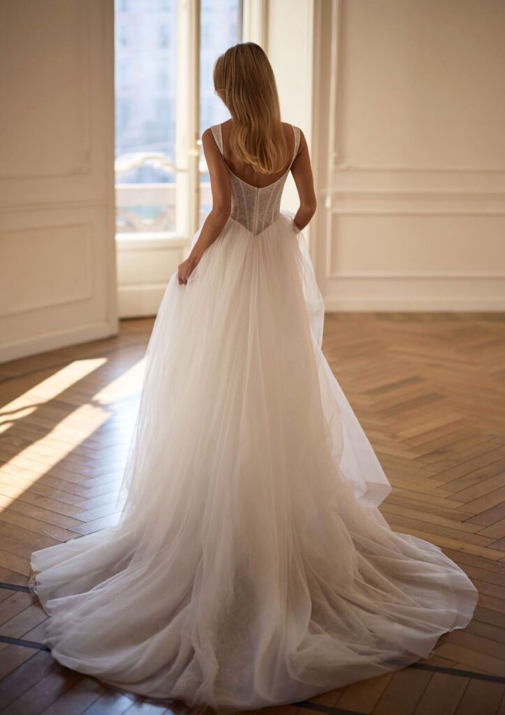 Style Melisande uit de Milla Nova-collectie, verkrijgbaar bij Koonings Bridal, is een opvallende off-the-shoulder prinsessenbruidsjurk van chantilly-kant. Het gestructureerde hartvormige korsetlijfje heeft een diepe illusion V-halslijn, ingebouwde cups en een subtiele, bloemrijke kantversiering over het geheel. Afneembare off-the-shoulder bandjes zijn versierd met bloemrijke kant en parels, terwijl de U-vormige achterkant elegant sluit met een ritssluiting. De volumineuze, gelaagde tule-rok heeft een gedurfde hoge split aan de zijkant en een midi-sleep. Maak de look compleet met de verfijnde Melisande-choker met bloemapplicaties en parelversiering voor een moderne twist, of combineer met de Corlienne-kanten mouwen voor extra elegantie.