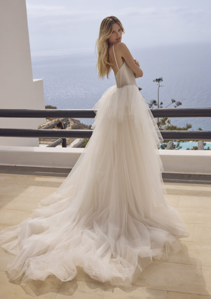 Indira – een echte show-stopper uit de Modeca Lux collectie. Deze fit-and-flare jurk is gemaakt van sprankelende tule en straalt pure glamour uit. De sweetheart halslijn versterkt de romantische uitstraling, terwijl de hoge split een verleidelijk accent toevoegt. De afneembare gelaagde tule sleep zorgt voor een dramatische, onvergetelijke entree – perfect om stijlvol het gangpad op te lopen. Voor een meer gestroomlijnde look is de jurk ook verkrijgbaar zonder sleep, als Indira-D. Ontdek Indira en de volledige Modeca Lux collectie bij Koonings.Model & materiaal