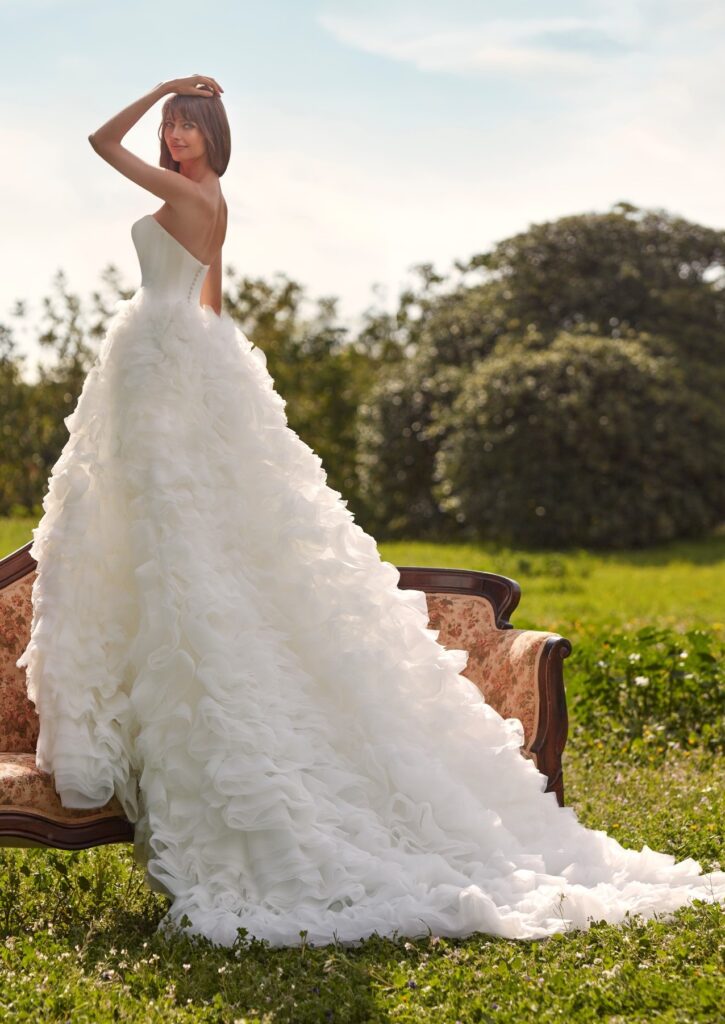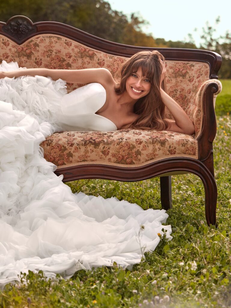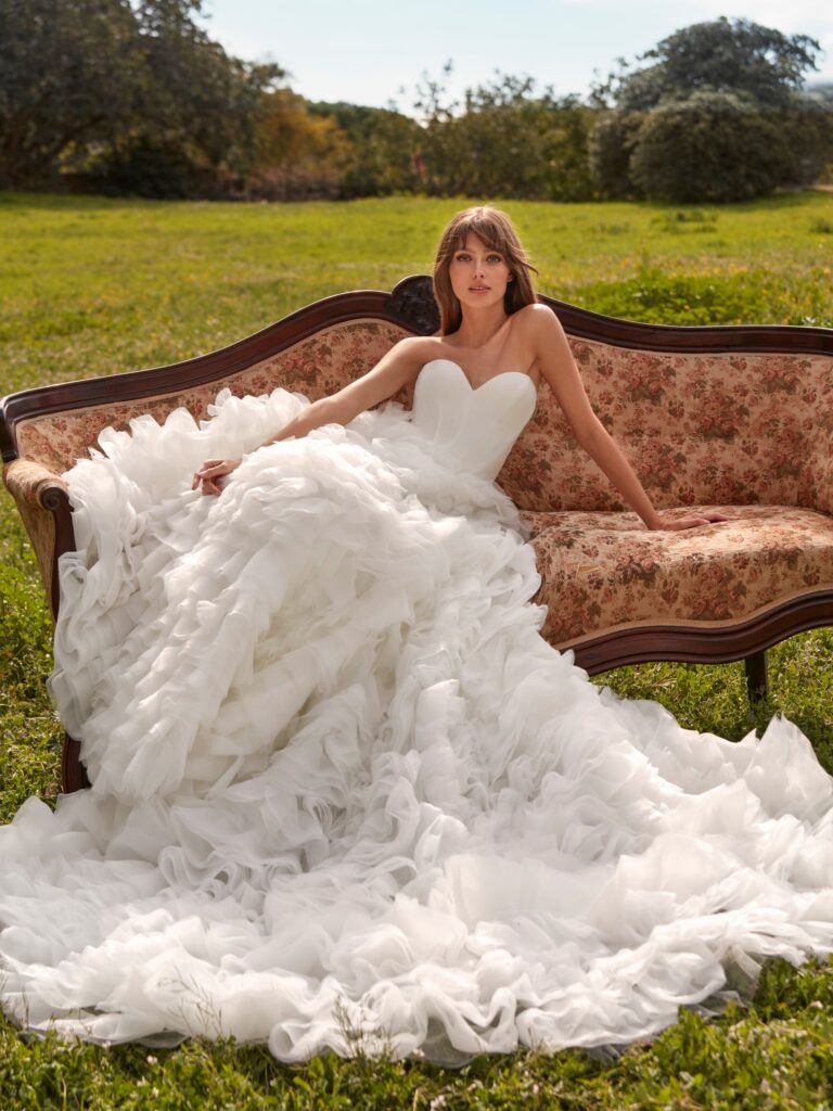 Een opvallend ontwerp uit de collectie van Nicole Milano, verkrijgbaar bij Koonings Bridal. Deze jurk combineert verschillende stoffen en texturen en creëert zo een perfecte prinsessensilhouet met een volumineuze rok en een verfijnd lijfje met een sweetheart-halslijn.