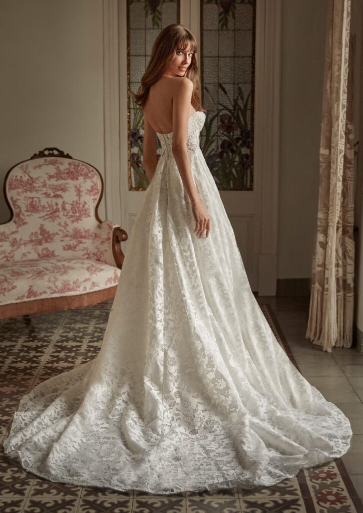 Deze guipure-jurk met afneembare mouwen uit de collectie van Nicole Milano combineert de charme van een sweetheart-halslijn met de sensualiteit van een open rug. De prinsessensilhouette past zich moeiteloos aan elk moment van de dag aan. Verkrijgbaar bij Koonings Bridal.