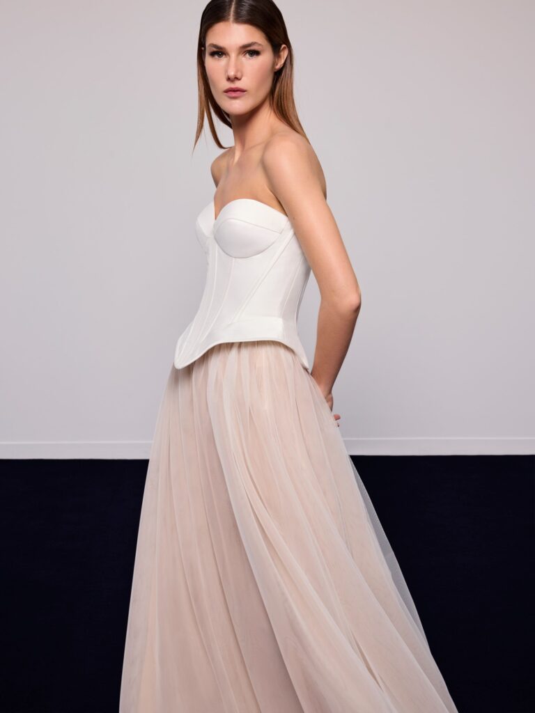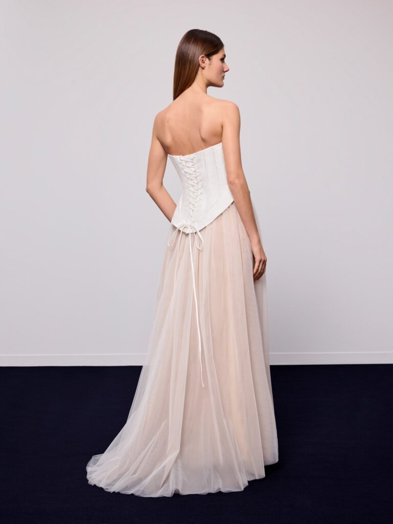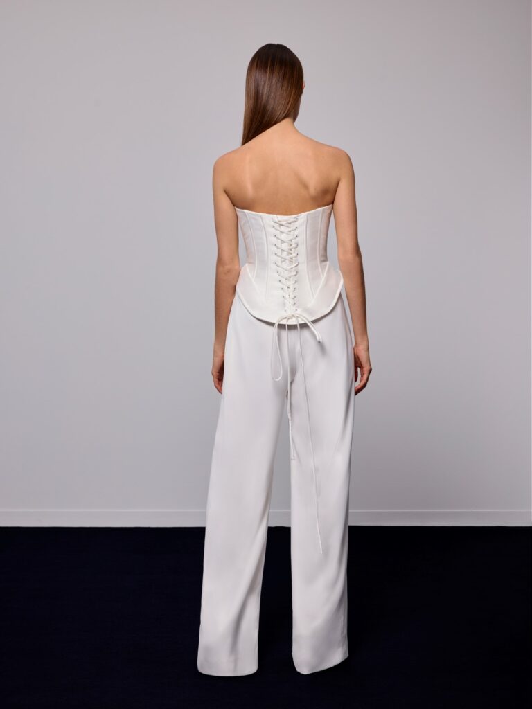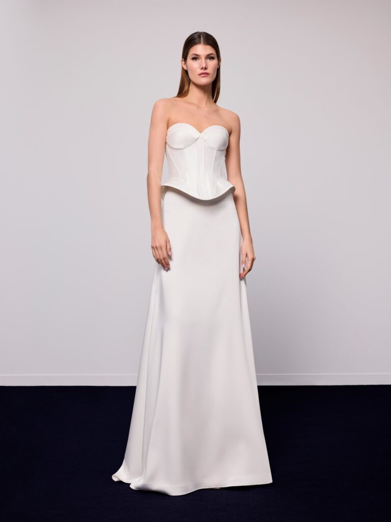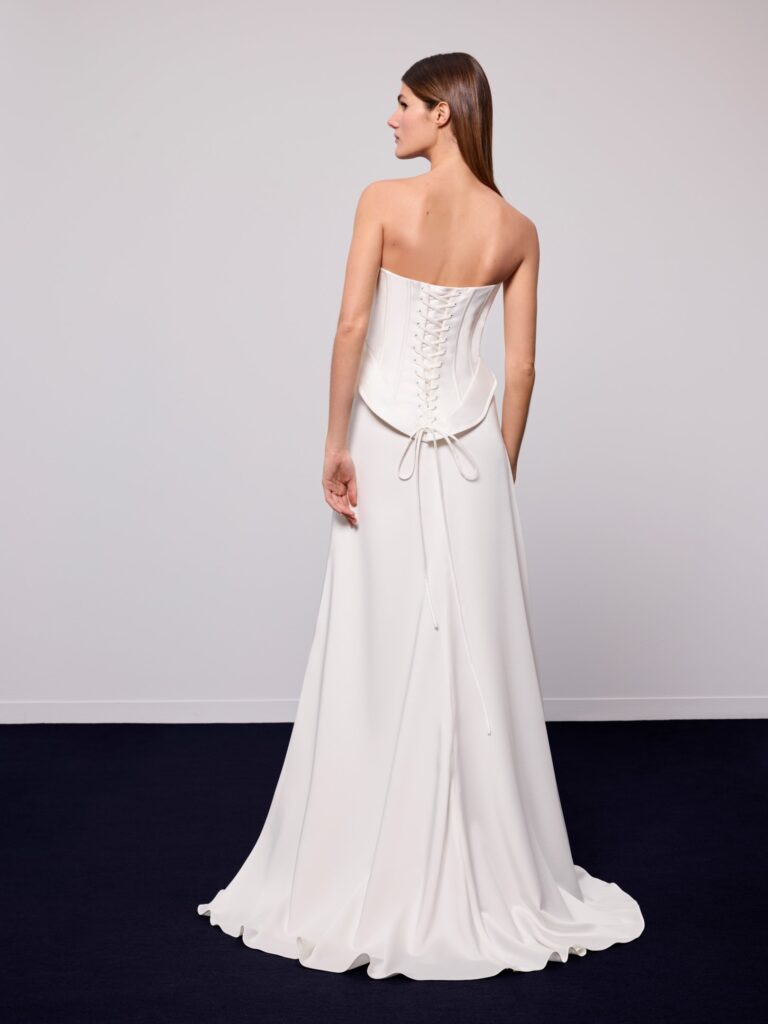 Een bridal top uit de bruidsmodecollectie van Pronovias met hartvormige halslijn, gemaakt van mikado. Het mouwloze ontwerp met getailleerde pasvorm biedt een elegante en tijdloze uitstraling. Verkrijgbaar bij Koonings Bridal.