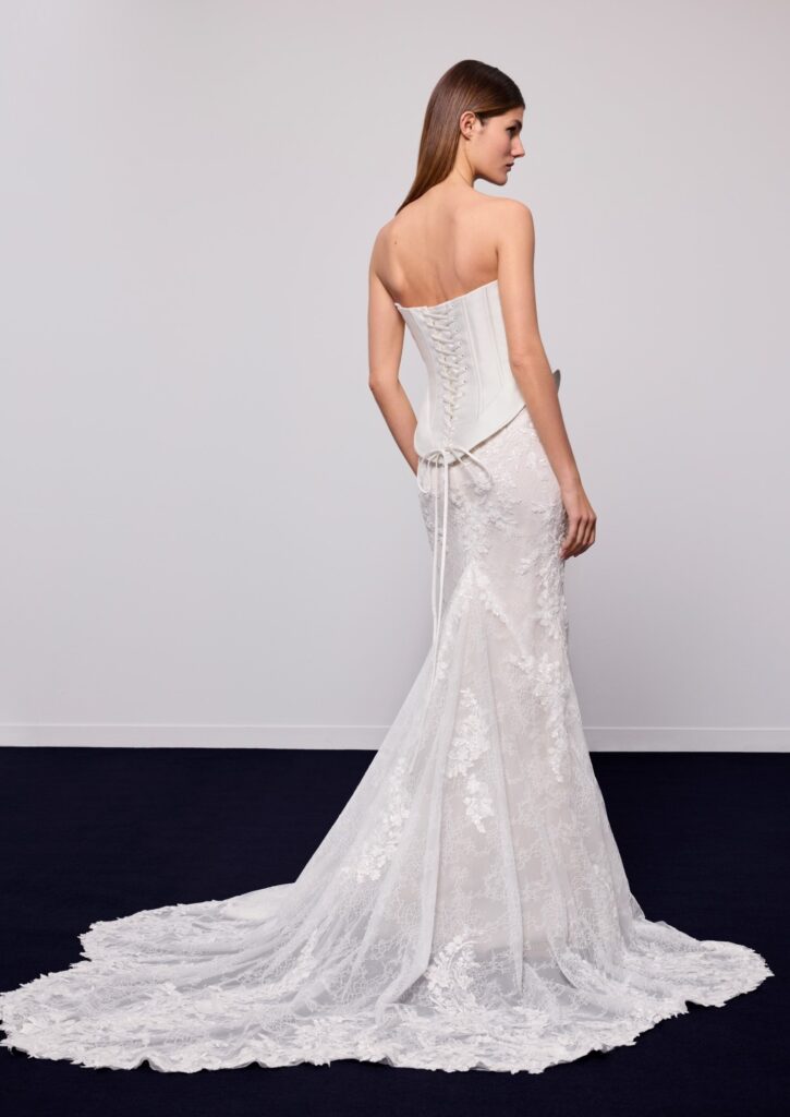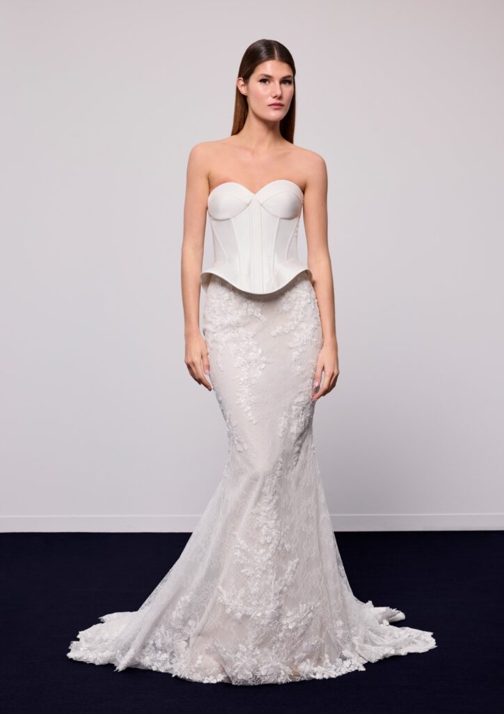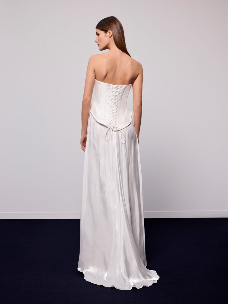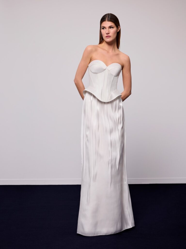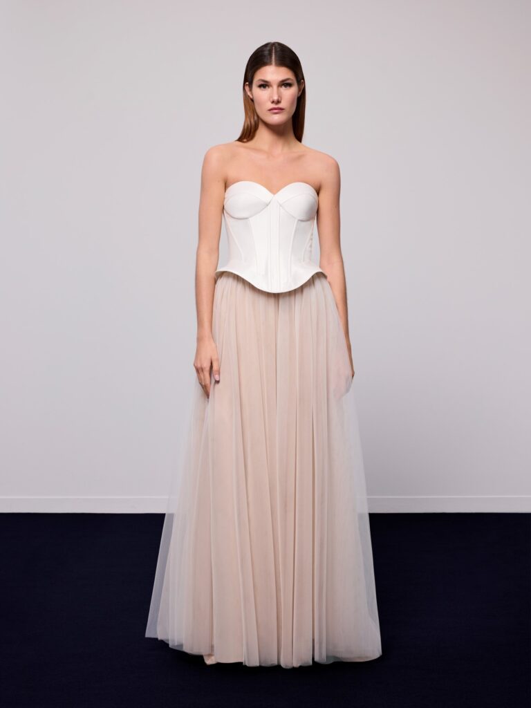 Een bridal top uit de bruidsmodecollectie van Pronovias met hartvormige halslijn, gemaakt van mikado. Het mouwloze ontwerp met getailleerde pasvorm biedt een elegante en tijdloze uitstraling. Verkrijgbaar bij Koonings Bridal.