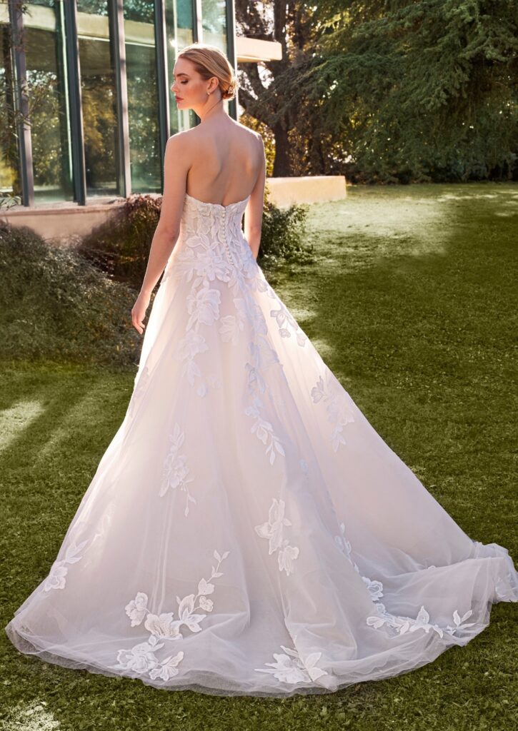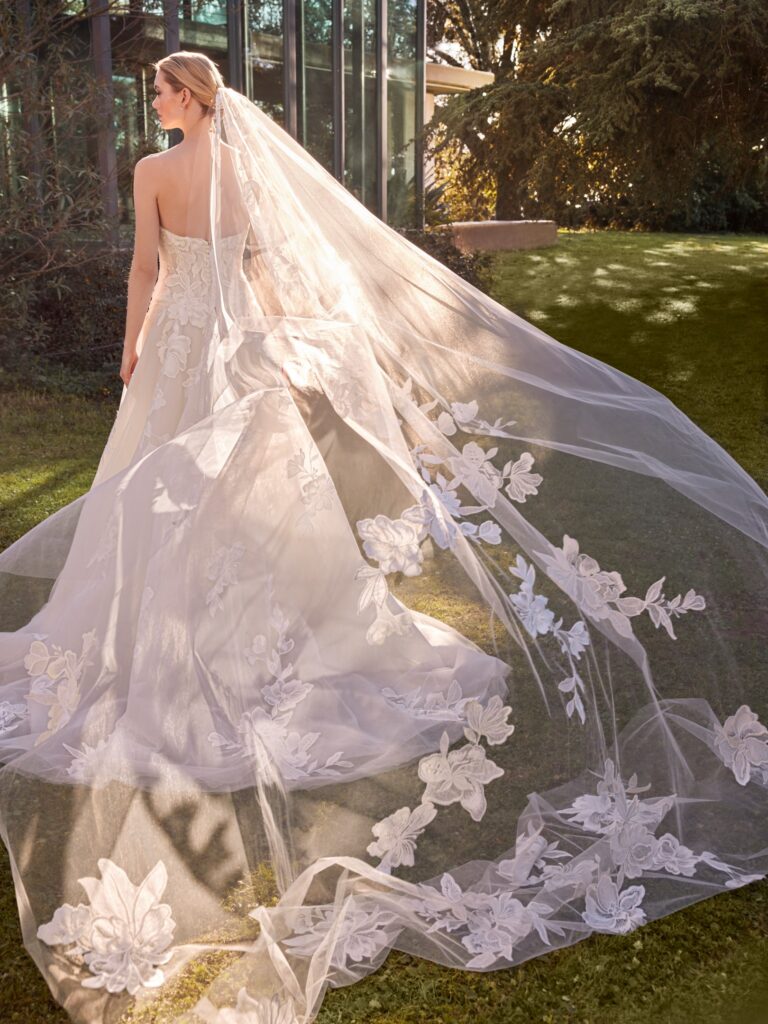 Een A-lijn jurk uit de bruidsmodecollectie van Pronovias met hartvormige halslijn, vervaardigd uit tule en kant. Perfect voor bruiden die op zoek zijn naar een elegante, vloeiende en tijdloze look. Verkrijgbaar bij Koonings Bridal.
