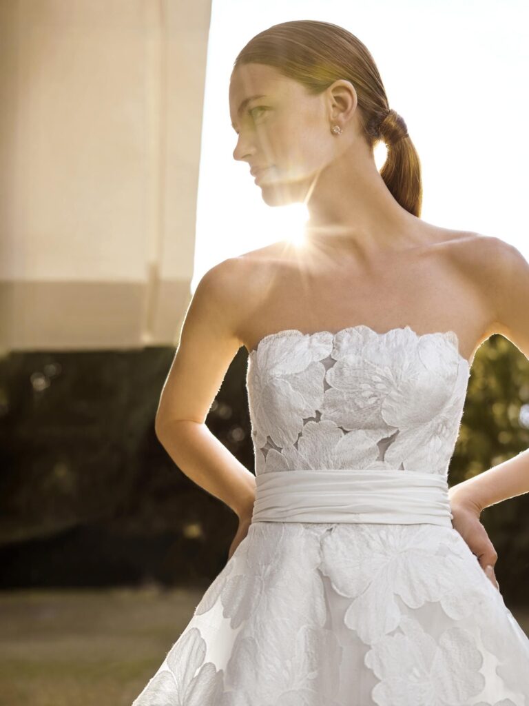 Dit prinsessensnit-ontwerp van Pronovias combineert een strapless halslijn met een lange, afneembare ceintuur voor een persoonlijke touch. Grote bloemrijke kantapplicaties op tule geven een majestueuze uitstraling, perfect voor de bruid die opvalt met elegantie. Verkrijgbaar bij Koonings Bridal.