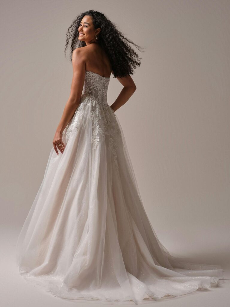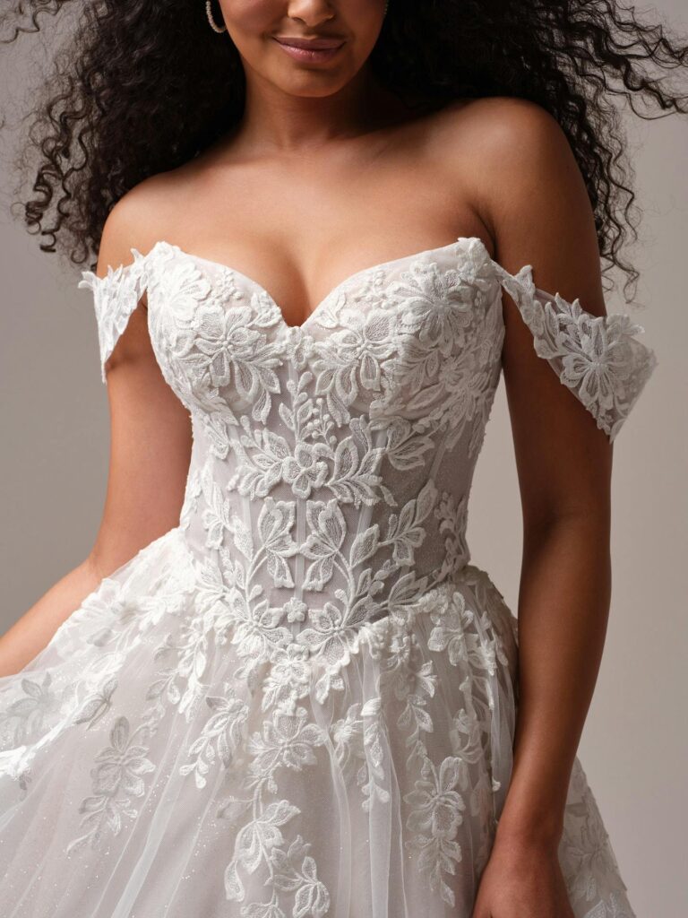 Trouwjurk Paige van Rebecca Ingram, verkrijgbaar bij Koonings. Romantiek en moderne elegantie komen samen in deze prachtige A-lijn trouwjurk, ontworpen voor de bruid die droomt van zachte, tijdloze verfijning met een subtiele sprankeling. Deze vrouwelijke jurk heeft een flatterende cat-eye sweetheart-halslijn, ondersteund door een delicaat gevormde basque-tailleur die de taille benadrukt en het silhouet elegant verlengt. Het lijfje en de rok zijn versierd met zachte katoenen kantapplicaties, subtiel bezaaid met glinsterende pailletten voor een delicate shimmer bij elke beweging. De Paige jurk loopt uit in een lichte, romantische A-lijn rok, perfect om in te dansen, te vieren en een onvergetelijke entree te maken op je speciale dag.Model & materiaal