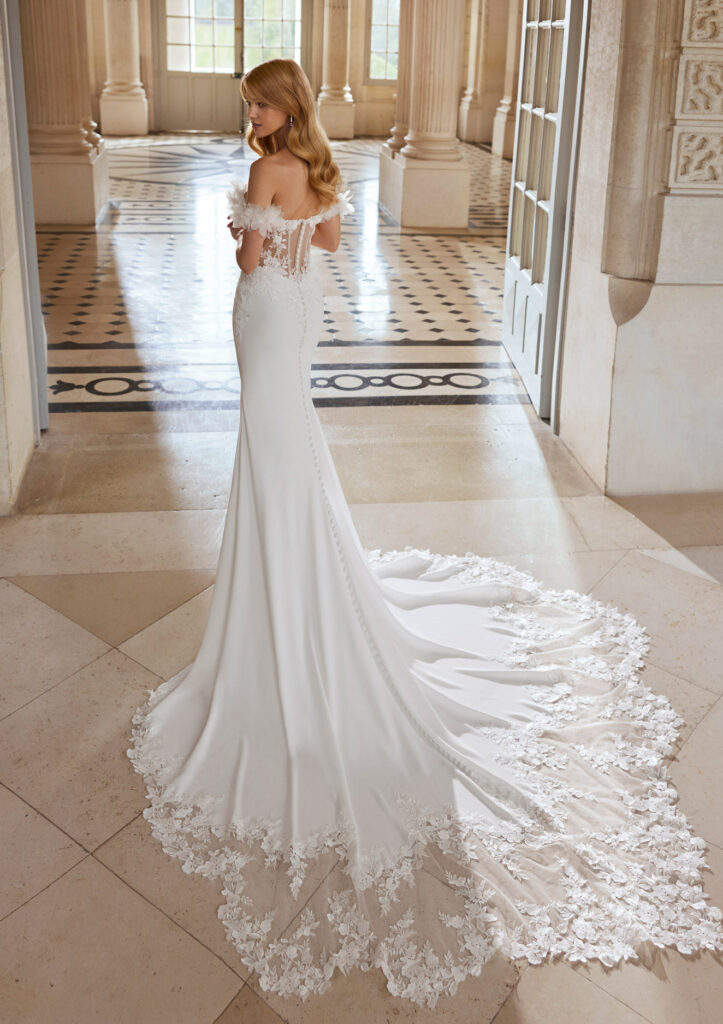 Sexy lange mermaid bruidsjurk met een bovenstuk van kant en crêpe. De jurk heeft een illusiehalslijn, een achterkant met knopen, off-shoulder bandjes en bloemrijke versieringen, prachtig gecombineerd met florale kant. Een moderne en stijlvolle look uit de Rosa Clará Dreams collectie.