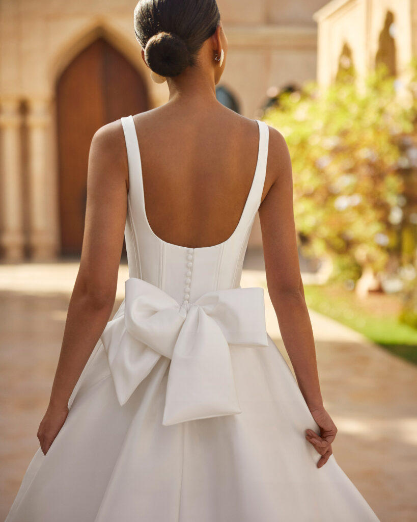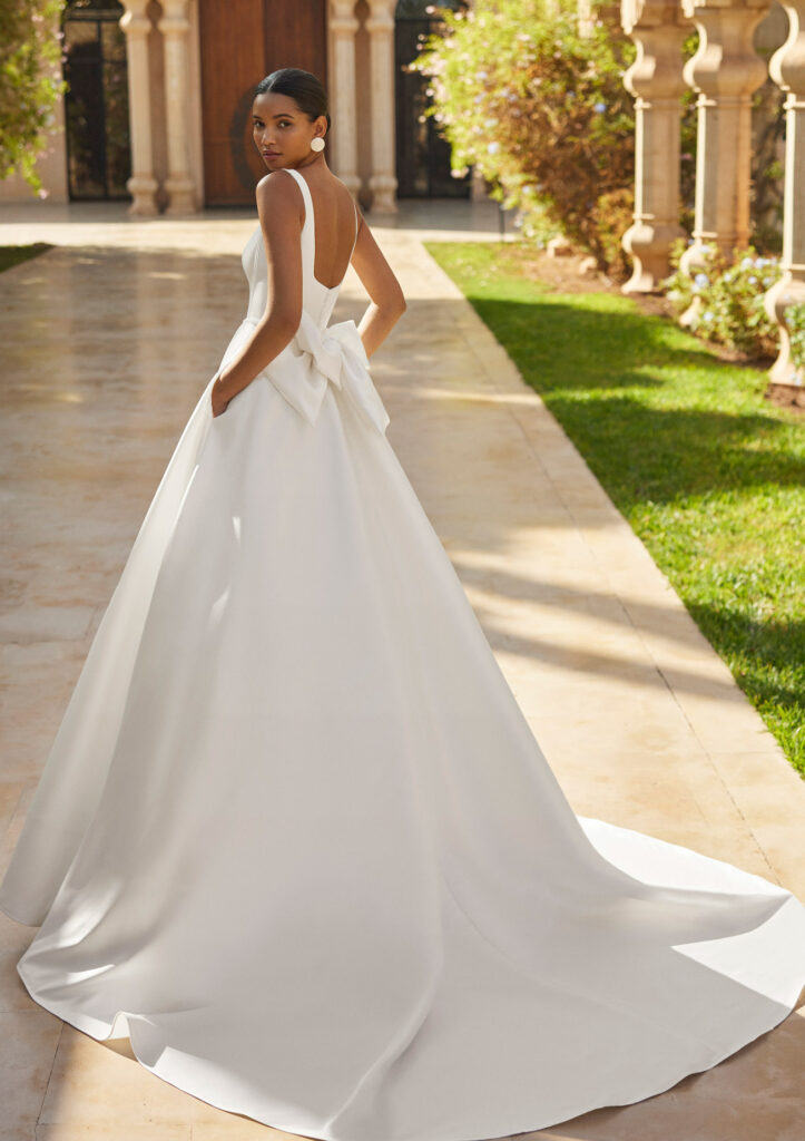 Lange A-lijn bruidsjurk van mikado, met een vierkante halslijn, choker, bandjes en een open rug met strik. Deze trouwjurk komt uit de collectie van Rosa Clará en is exclusief verkrijgbaar bij Koonings Bridal.
