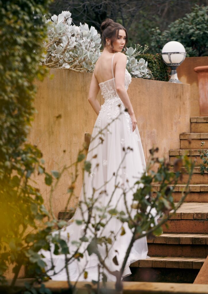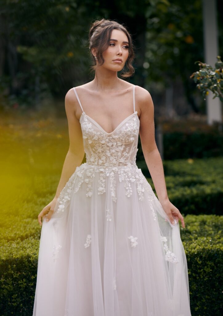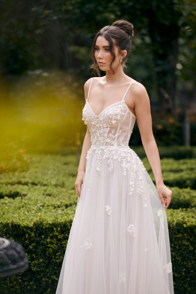 WS22962 — een betoverende A‑lijn trouwjurk uit de Evergreen-collectie van Wedding Societe. Deze jurk combineert zachte tule en kant met verfijnde 3D botanische appliqués voor een dromerige, romantische uitstraling. De klassieke sweetheart‑halslijn, subtiele spaghettibandjes en het flatterende A‑lijn silhouet zorgen dat de jurk elegant en vrouwelijk valt. Ideaal voor de bruid die houdt van romantiek, natuurlijke details en tijdloze elegantie.