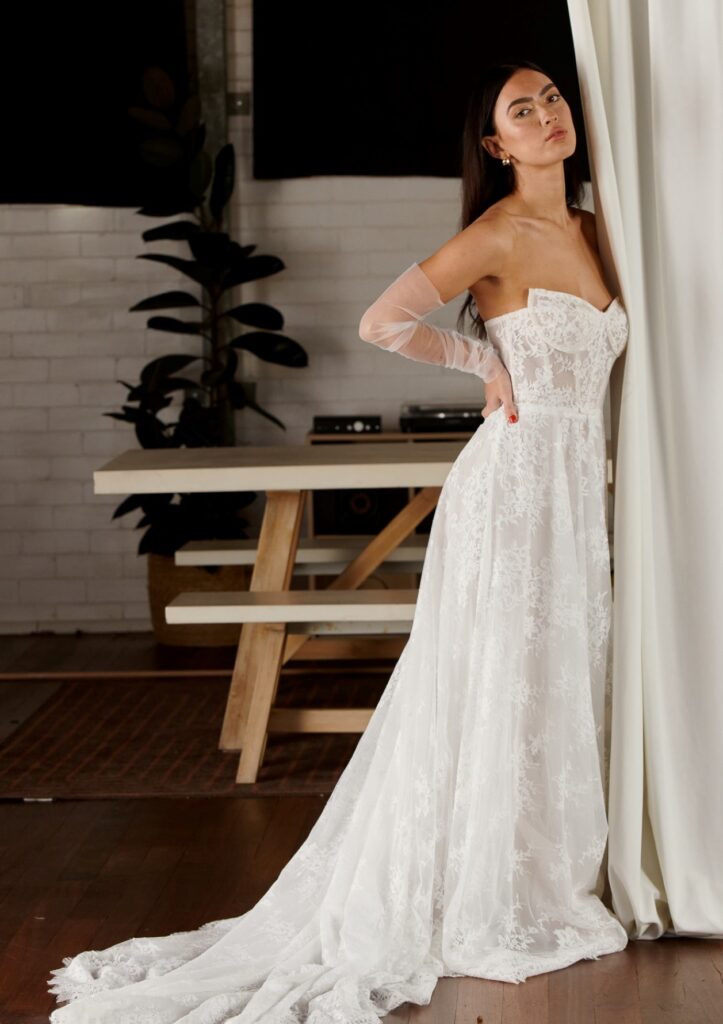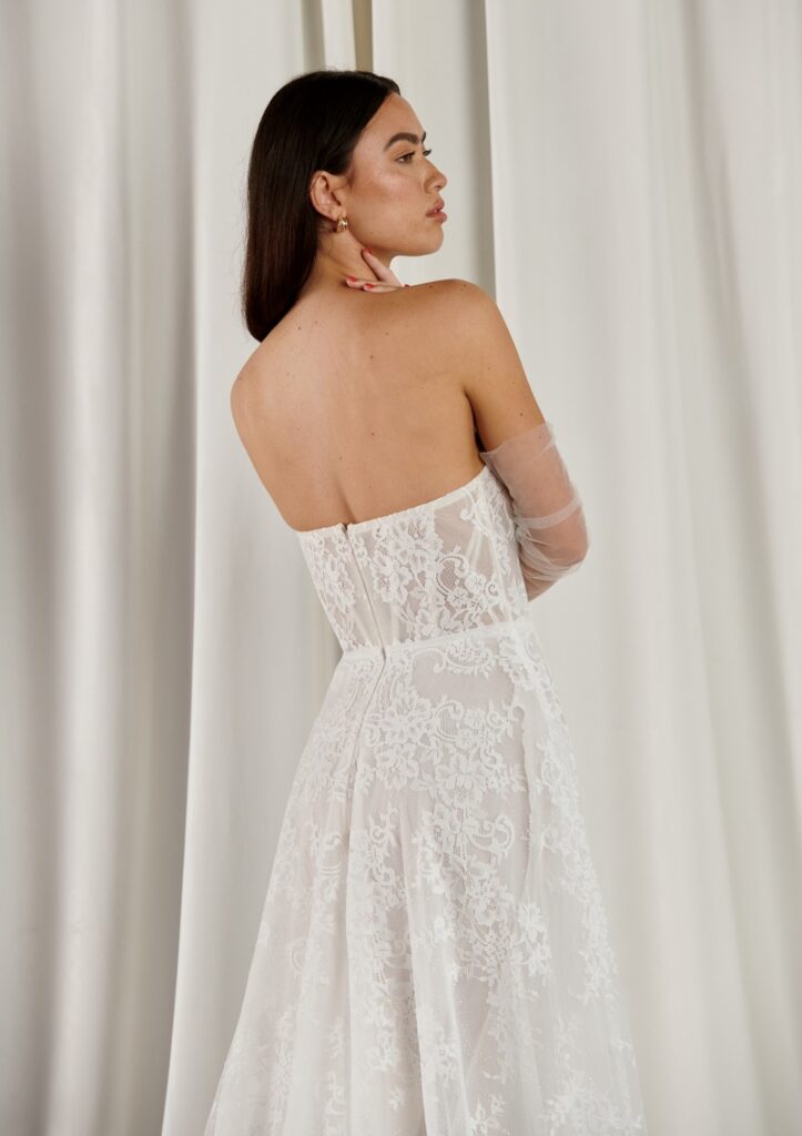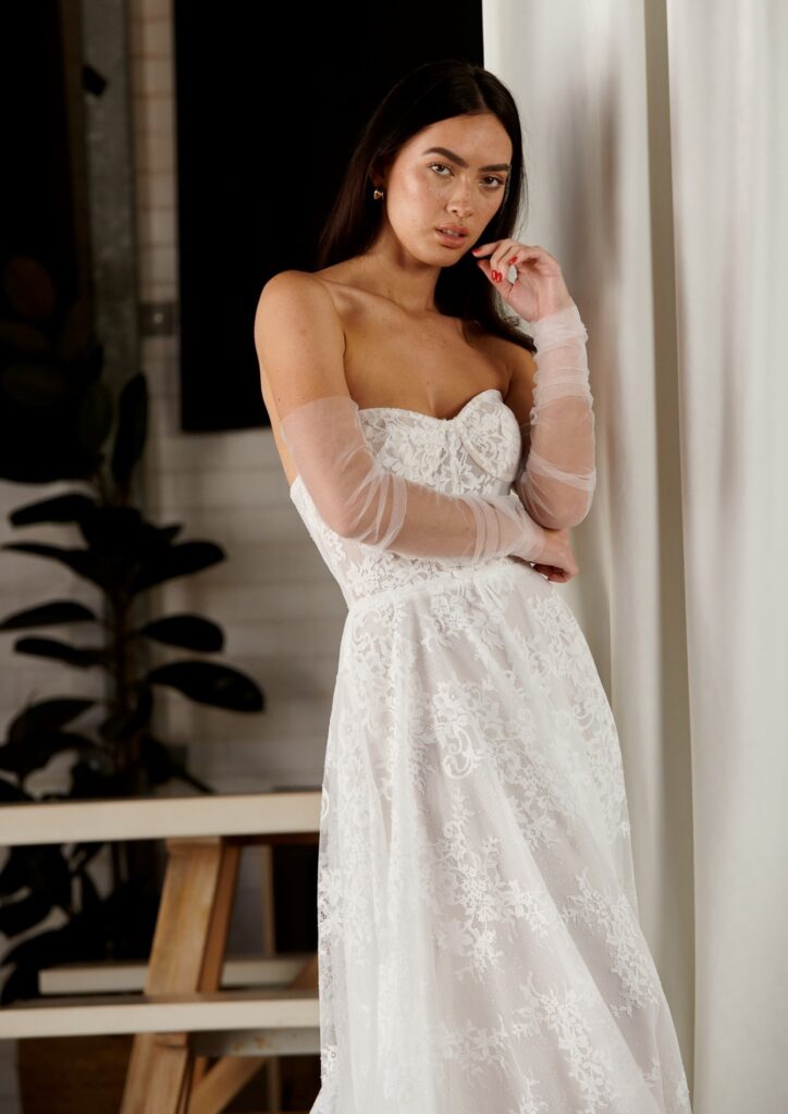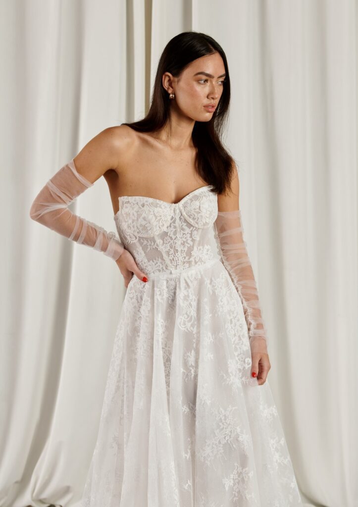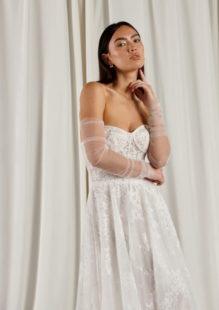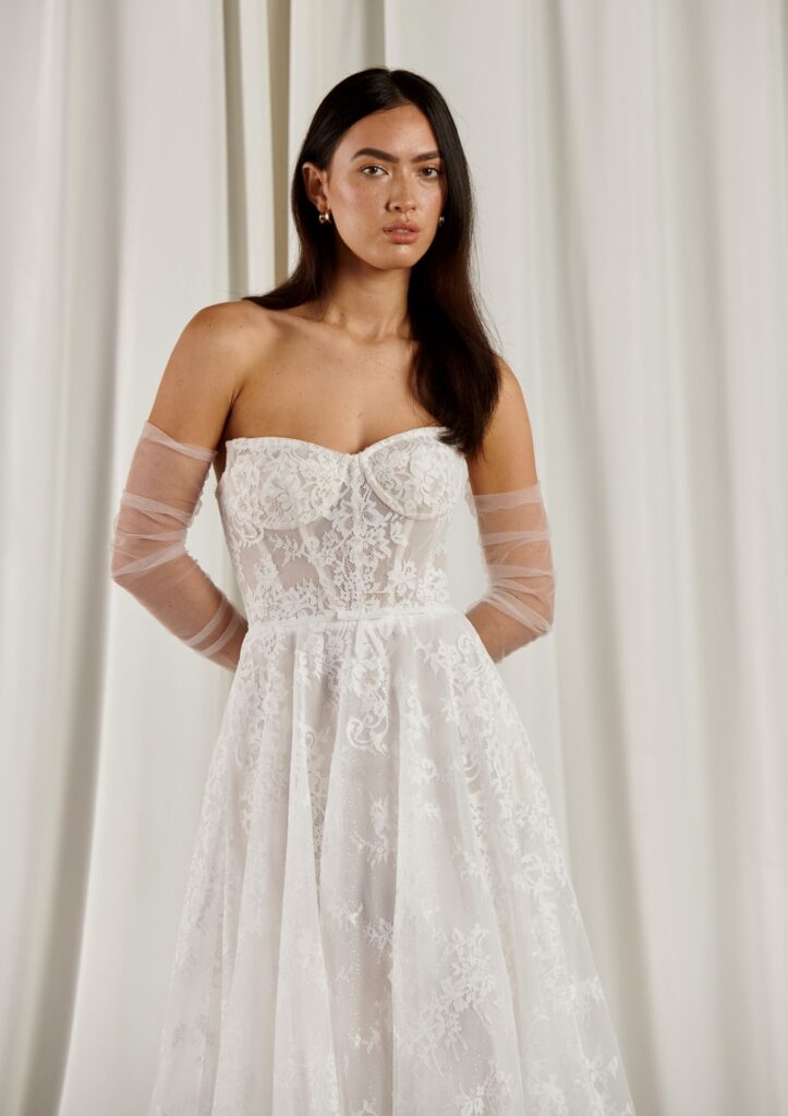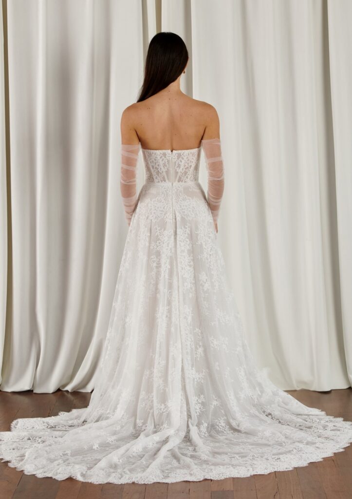 Boho‑chic met couture vibes! WA23203 belichaamt een boho‑chic droom: zachte tule mouwen gecombineerd met fijn kant maken deze jurk ideaal voor een bruiloft in de buitenlucht of een romantische ceremonie. De afneembare mouwen geven je de vrijheid om je look te transformeren — topjurk 2 in 1 voor ceremonie en feest.