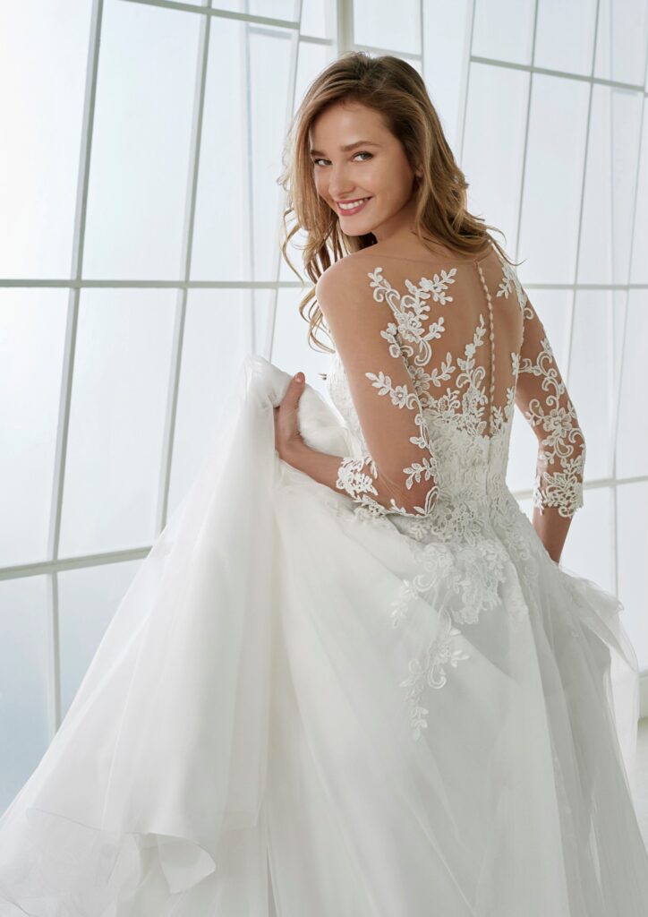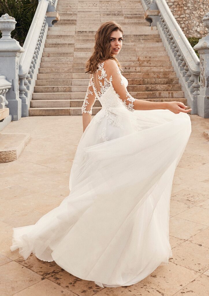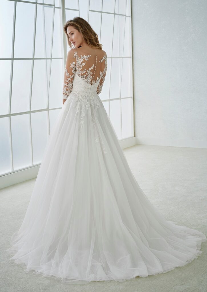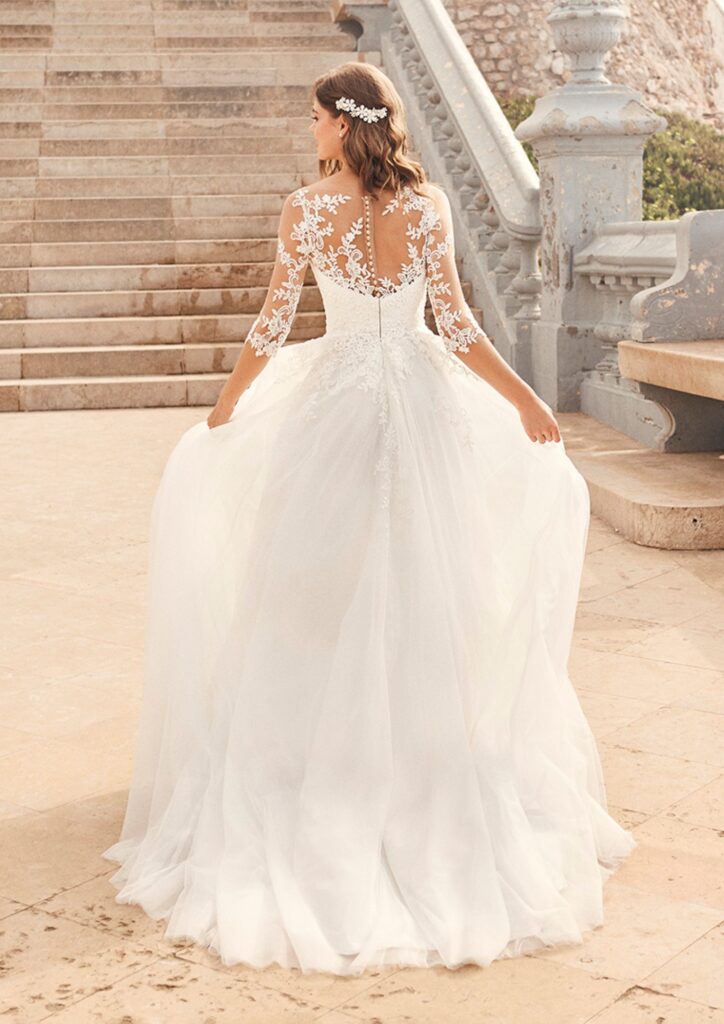 Deze prinsessenjurk uit de bruidsmode collectie van White One, verkrijgbaar bij Koonings Bridal, heeft een scoop halslijn, ¾-mouwen en een prachtige tule rok. De unieke ruglijn maakt het silhouet compleet, ideaal voor een romantische, sprookjesachtige look.